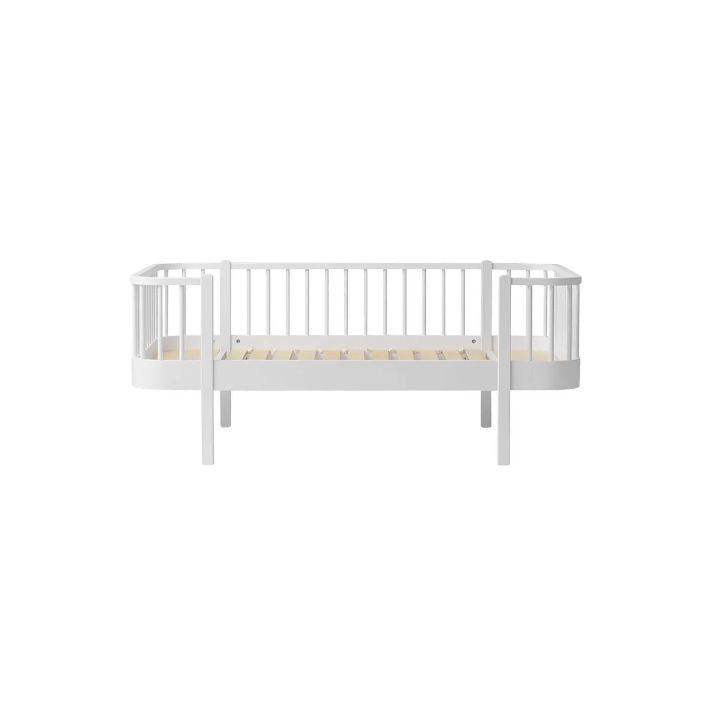 Wood Original Junior sofaseng i innovativt nordisk design. De runde hjørner, som er med til at skabe en tryg og hyggelig atmosfære for barnet om natten.Wood Original junior sofaseng kan bestilles med ben i smuk hvid-olieret nordisk eg eller helt hvid.Wood Original serien er fremstillet i birketræ og MDF, der er konstrueret træ, der består af 60% birk, 20% fyrretræ og 20% asp træ. MDF er meget stærkt og holdbart. Serien tilbydes i to forskellige modeller: en med ben i smuk, hvid-olieret massiv eg og en i helt hvid med ben i massiv birk.De ikke-synlige skruer giver sengen et rent og eksklusivt design og er særligt kendetegnende for Oliver Furniture. Stilen er skandinavisk med rene linjer, runde former og enkle detaljer.Sengen er produceret i Europa og overholder de strenge EU-krav for sikkerhed og sundhed. Produkterne er malet med ikke-giftig, vandbaseret maling.Bæreevne (statisk vægt): 120 kg