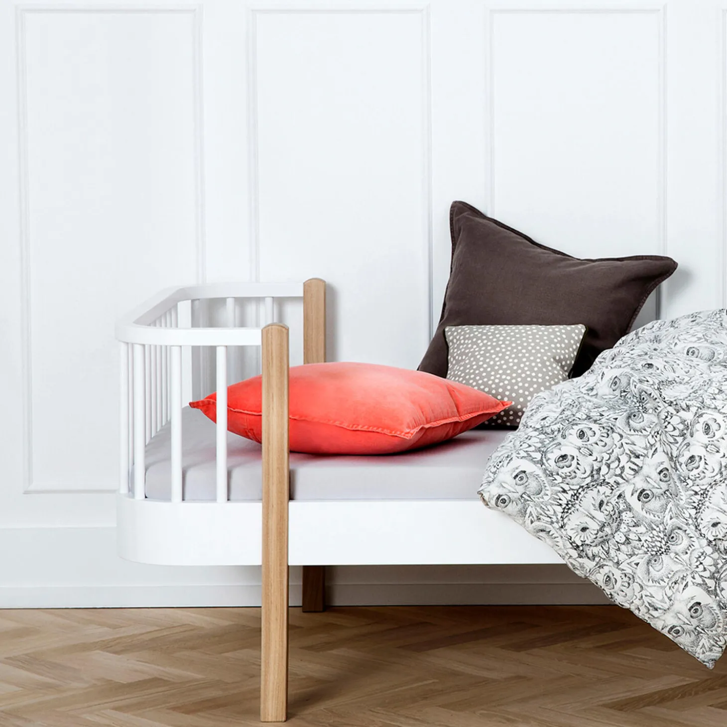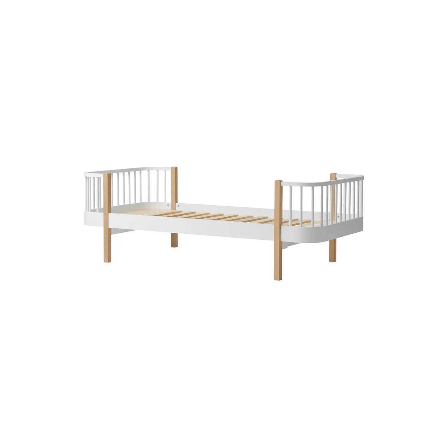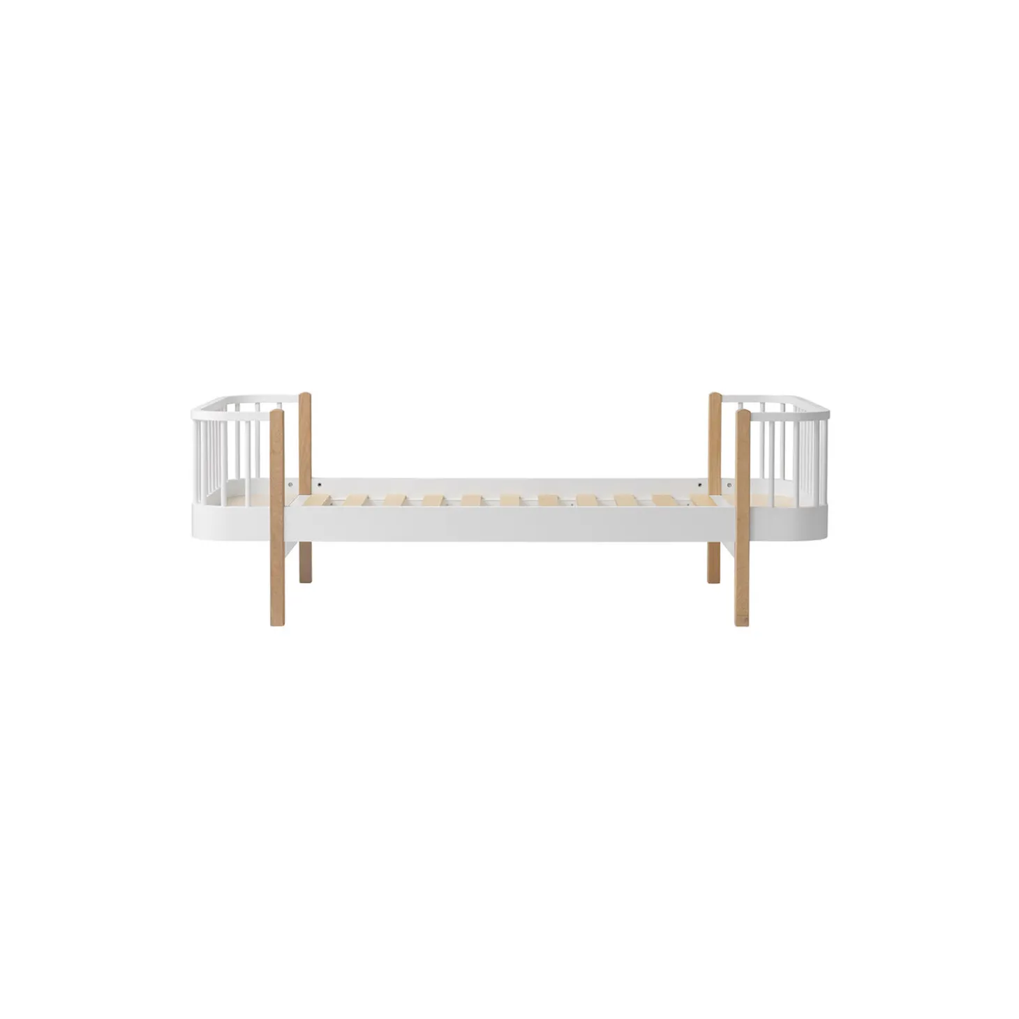 Sengen fra Wood Original serien er tænkt til det store barn eller teenageren. Wood Original seng passer med sit enkle udseende ind i de fleste værelser. Designet er unikt, og stilen er klassisk nordisk. De runde hjørner er med til at give sengen et indbydende udseende. Wood Original seng er hvid, hvor man selv kan vælge om man ønsker benene i tilsvarende hvid, eller i hvidolieret egetræ som giver sengen et helt specielt udseende.Wood Original serien er fremstillet i birketræ og MDF, der er konstrueret træ, der består af 60% birk, 20% fyrretræ og 20% asp træ. MDF er meget stærkt og holdbart. Serien tilbydes i to forskellige modeller: en med ben i smuk, hvid-olieret massiv eg og en i helt hvid med ben i massiv birk.De ikke-synlige skruer giver sengen et rent og eksklusivt design og er særligt kendetegnende for Oliver Furniture. Stilen er skandinavisk med rene linjer, runde former og enkle detaljer.Sengen er produceret i Europa og overholder de strenge EU-krav for sikkerhed og sundhed. Produkterne er malet med ikke-giftig, vandbaseret maling.Bæreevne (statisk vægt): 120 kg