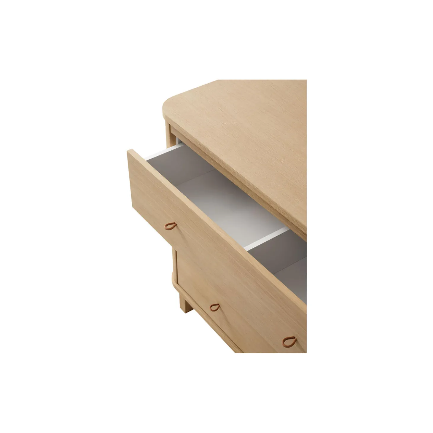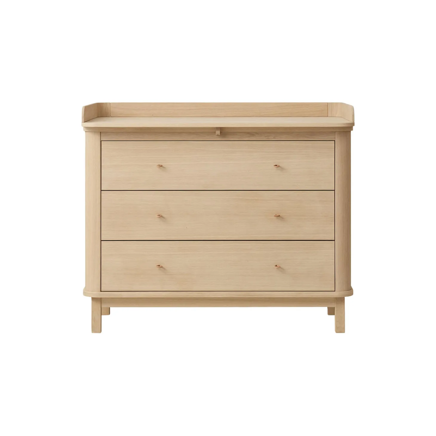 Puslekommoden i eg er en elegant og funktionel løsning til børneværelset. Med sit varme, naturlige udseende og nordiske design tilfører den både stil og praktisk opbevaring. Kommoden har tre rummelige skuffer, hver opdelt i to rum, hvilket giver god plads til opbevaring af babyens tøj, bleer og sengetøj – alt let tilgængeligt, så man kan holde fokus på barnet.Skufferne er monteret på kvalitetsskinner med soft-close, der sikrer, at de glider let og lukker langsomt, hvilket både beskytter små fingre og bidrager til en rolig atmosfære, så barnet kan sove uforstyrret. Puslepladen med afrundede hjørner giver rigelig plads til en puslepude og andet nødvendigt babyudstyr. Greb i 100 % kernelæder fremhæver det stilfulde design, mens de integrerede knager på siderne kan skubbes ud og ind for ekstra opbevaringsmuligheder.Når puslepladen ikke længere er nødvendig, kan den nemt fjernes uden at efterlade spor. Kommoden kan derefter bruges som et elegant møbel i børneværelset eller andre steder i hjemmet. Den høje kvalitet og det tidløse design sikrer, at møblet har en lang levetid.