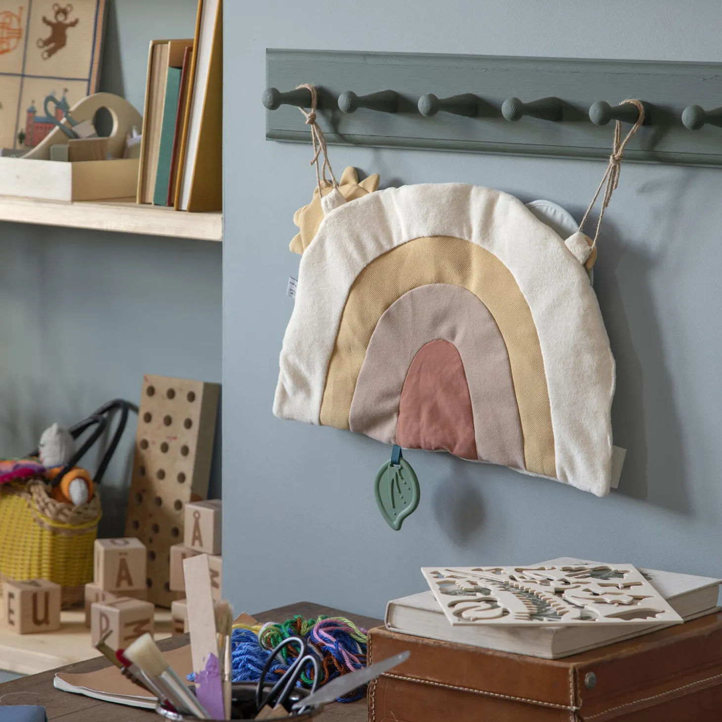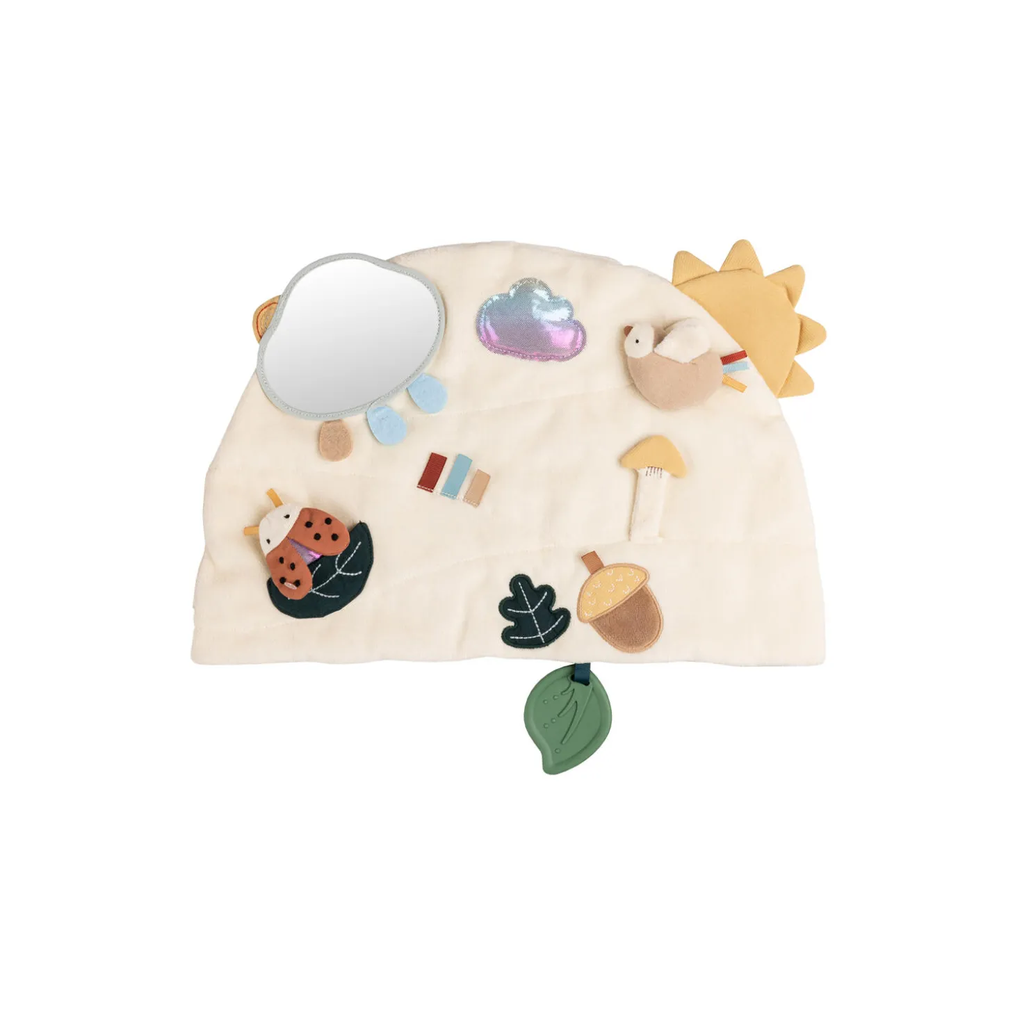 Blødt aktivitetspanel fyldt med detaljer som stimulerer babys finmotorik og nysgerrighed. Hæng aktivitetspanelet op i kravlegården, ved puslebordet eller brug det som legetøj i klapvognen.