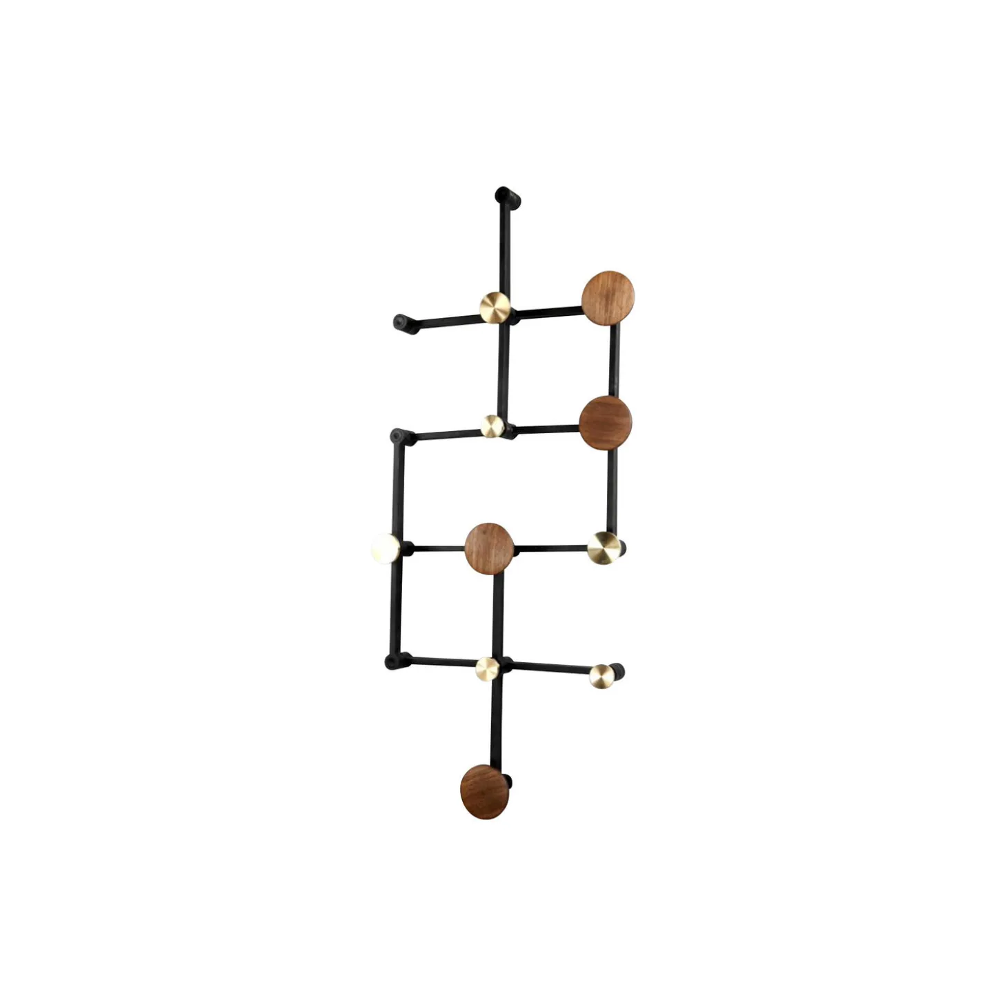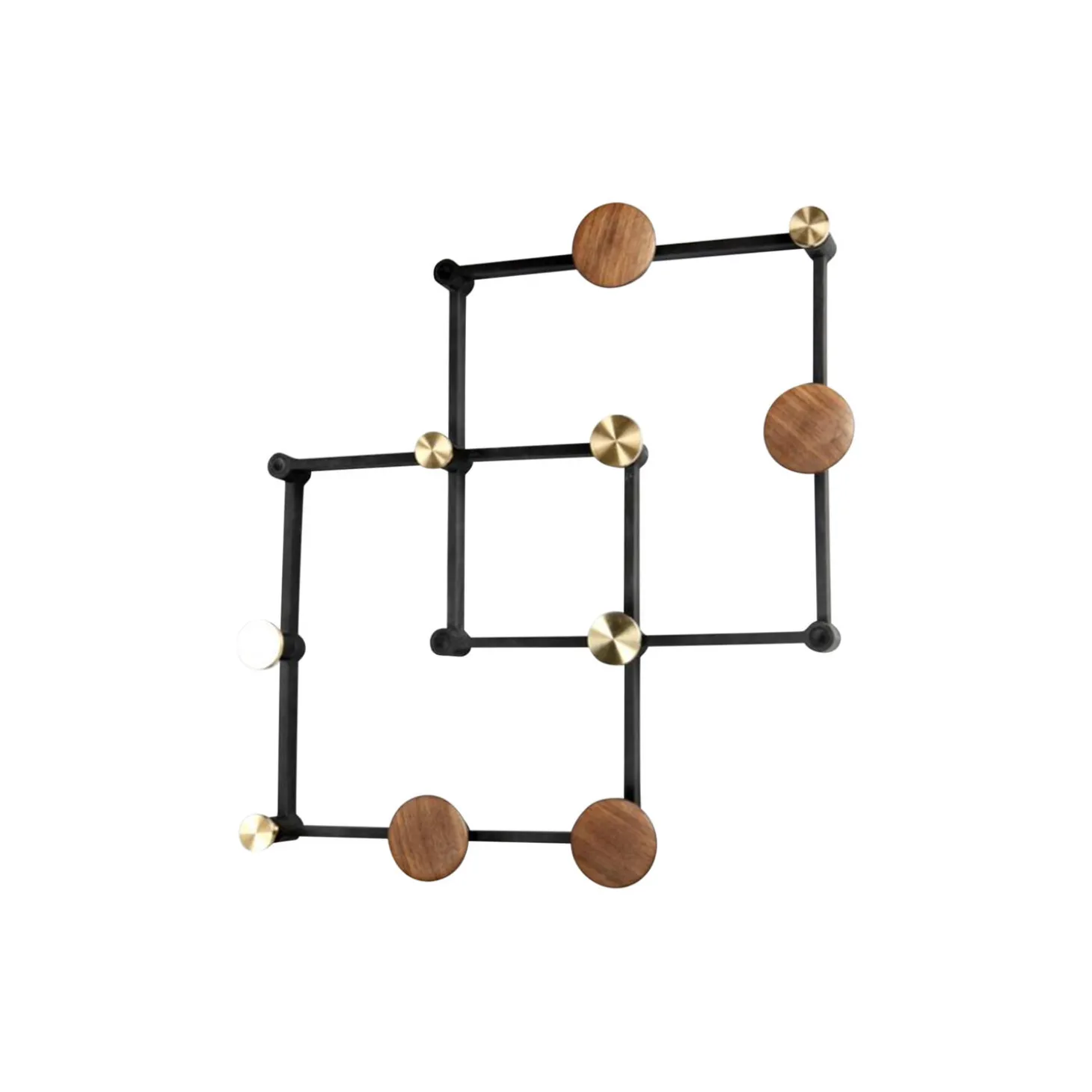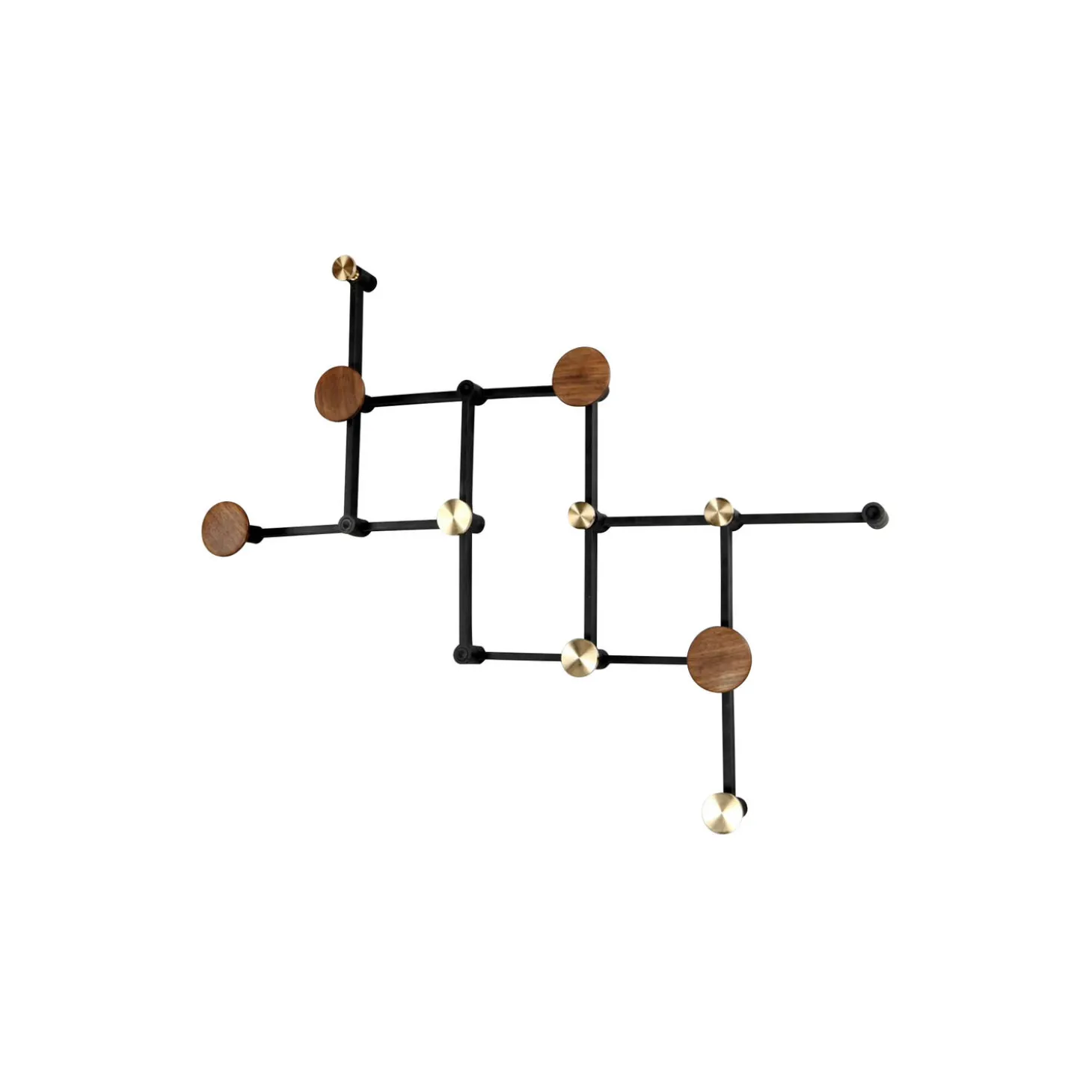 X•TEND knagerække i genbrugsplast, valnød, messing fra X•TEND. Farve: sort/valnød. Sæt med 8 arme i 30,5 cm, 4 træknopper i 6,3 cm og 6 messingknopper i 2 størrelser 2,8 cm og 3,8 cm.