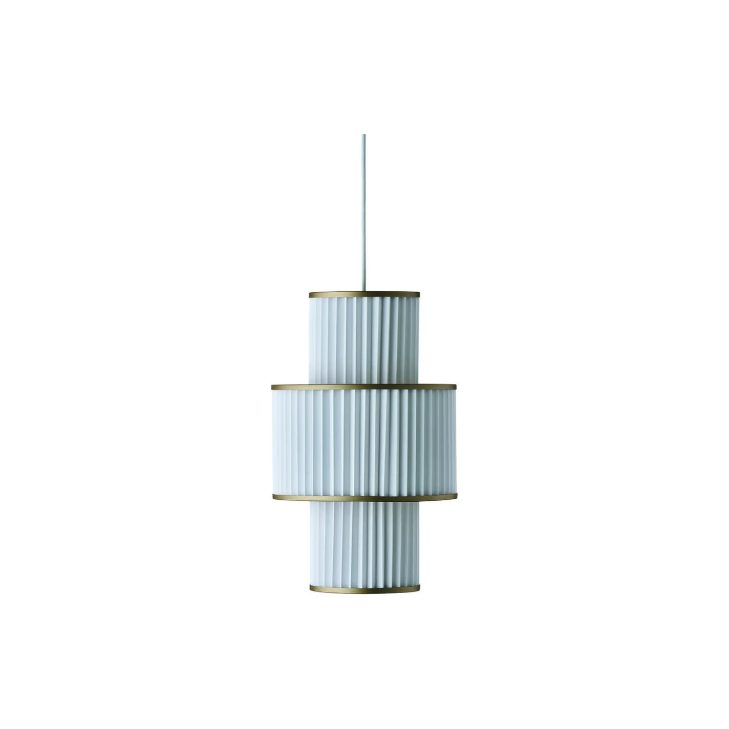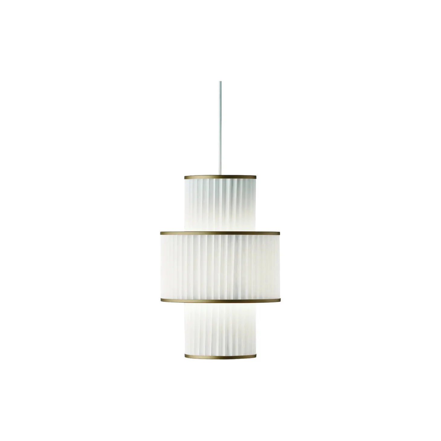 PLIVELLO pendel golden i aluminium, stål og papir fra LE KLINT. Farve: hvid. Mål: H: 49 x Ø 30 cm. Lyskilde: E27. Design: Christian Troels.