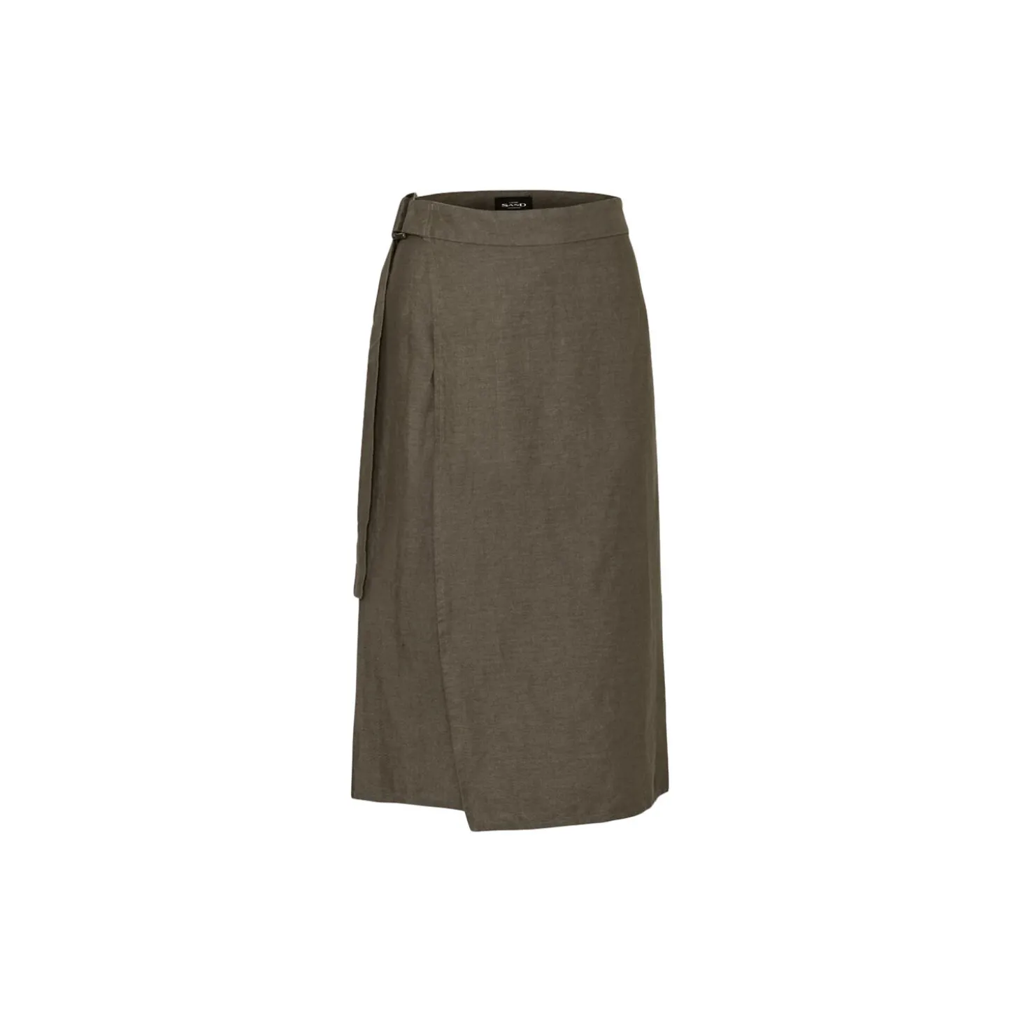 Wrap skirt with belted waist with buckle. Slightly flared silhouette. Knee length