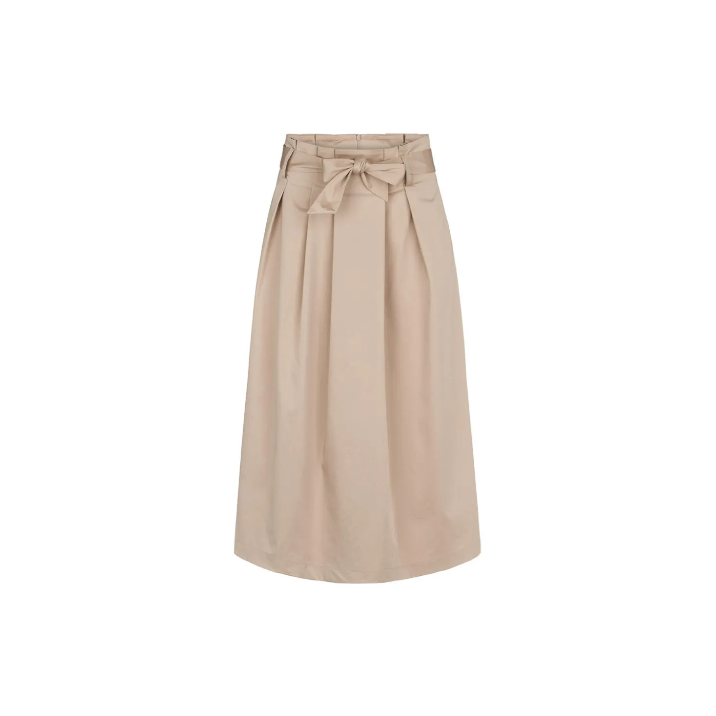 Belted skirt with pleated waist. Irregular front pleats. Fabric belt at waist with belt loops. Pockets in front side seam. Flared silhouette