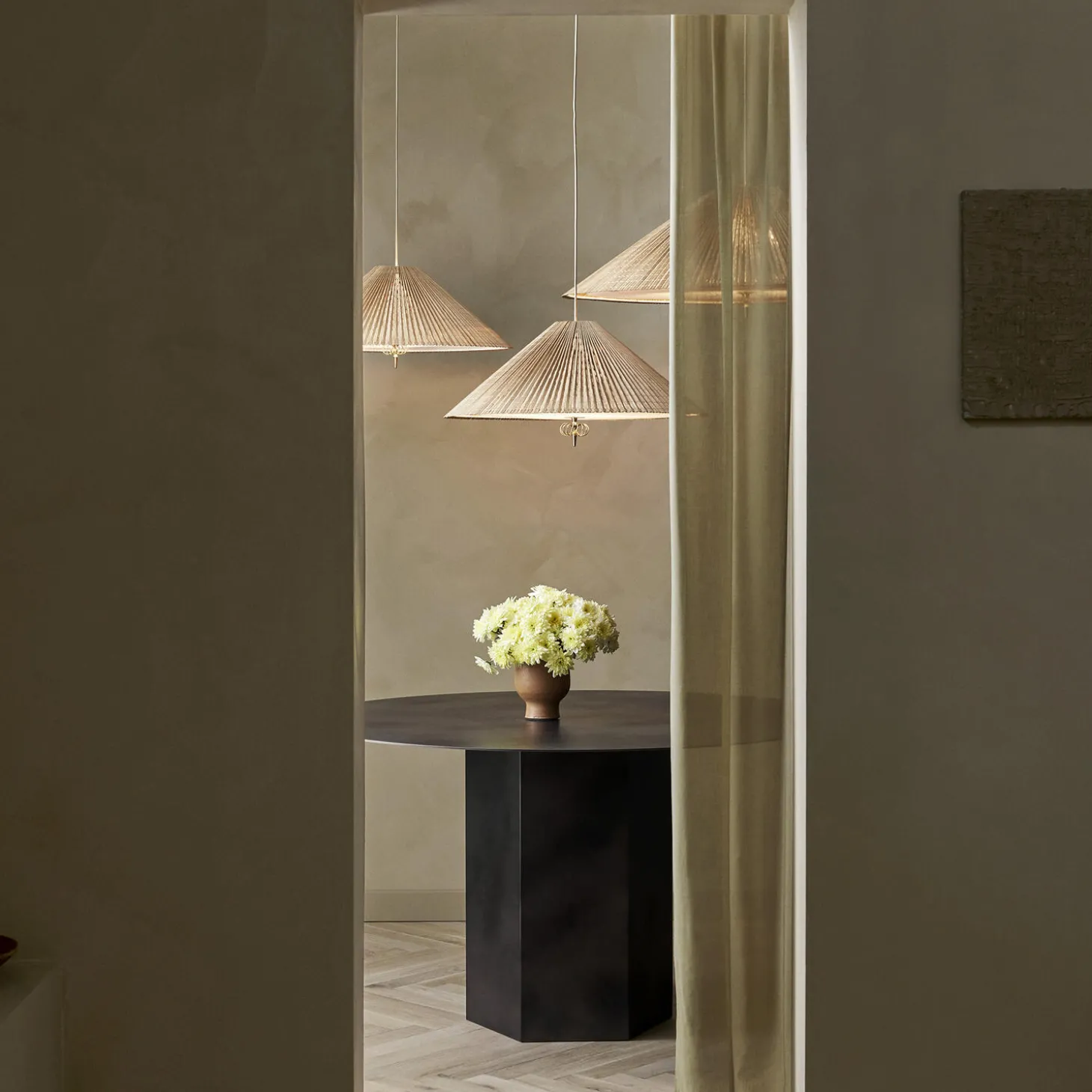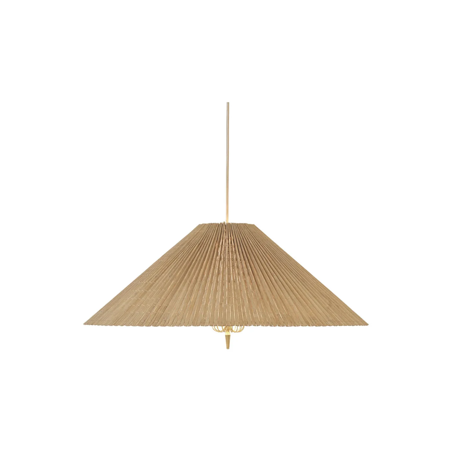 Designed by the legendary Paavo Tynell, the 1972 pendant features a conical shade in bamboo, crafted by master artisans. The the bamboo slats are hand sewn into a pleated mat and fastened by hand to the wire frame, with a linen liner in between. This directs light down towards the base and creates a diffuse glow around the shade and upward, as the bamboo slats are penetrated by the light. Tynell’s signature brass details are present as well, adding an air of timelessness and perfectly complementing the warm tone of the wood and light. Below the bulb, a fabric diffuser modulates the light and, beneath this, a decorative brass detail gives each lamp a flourish of character, and subtly influences the play of light it generates.