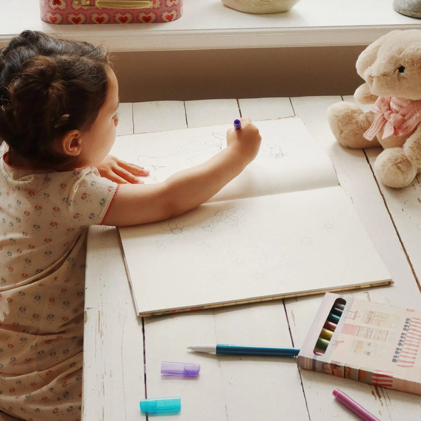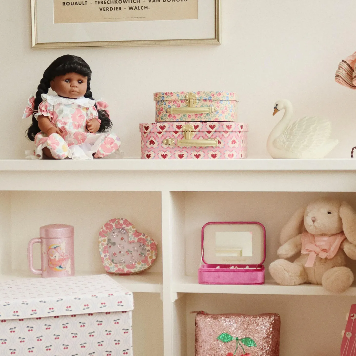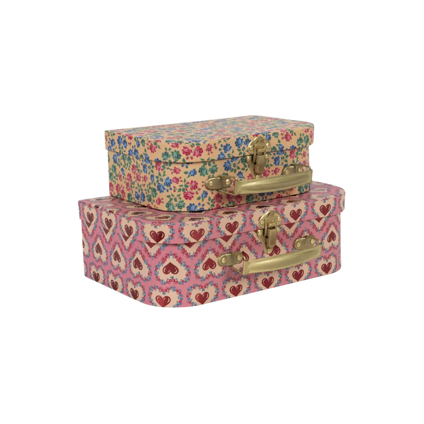 Set of two cardboard play suitcases with a metal handle. The smaller suitcase fits into the larger one. A perfect place to store little treasures.