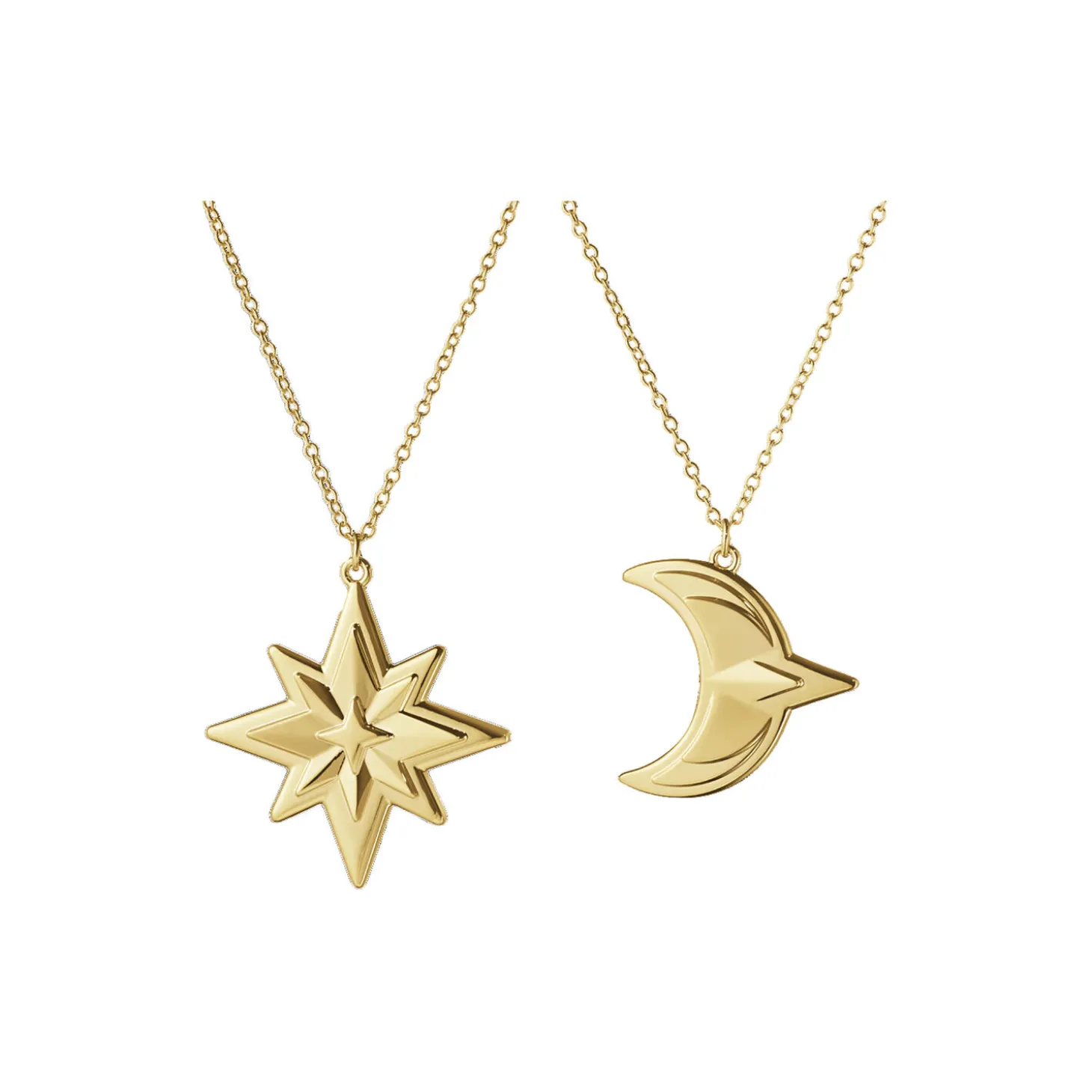 De to elegante juleornamenter er designet af Georg Jensens mangeårige samarbejdspartner Sanne Lund Traberg. Ornamenterne er en del af 2024 Julekollektionen, som henter inspiration fra nattehimlen. Sættet består af et stjerneformet og et halvmåneformet ornament, som begge hænger i en fin guldkæde og er belagt med funklende guld.
