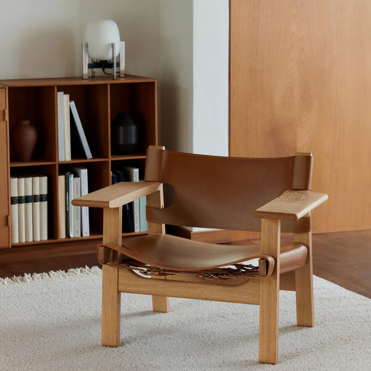 2226 Den Spanske Stol i olieret eg og kernelæder fra Fredericia. Farve: cognac/olieret eg. Mål: H: 67 x B: 82,5 x D: 60 cm. Siddehøjde: 33 cm. Design: Børge Mogensen.