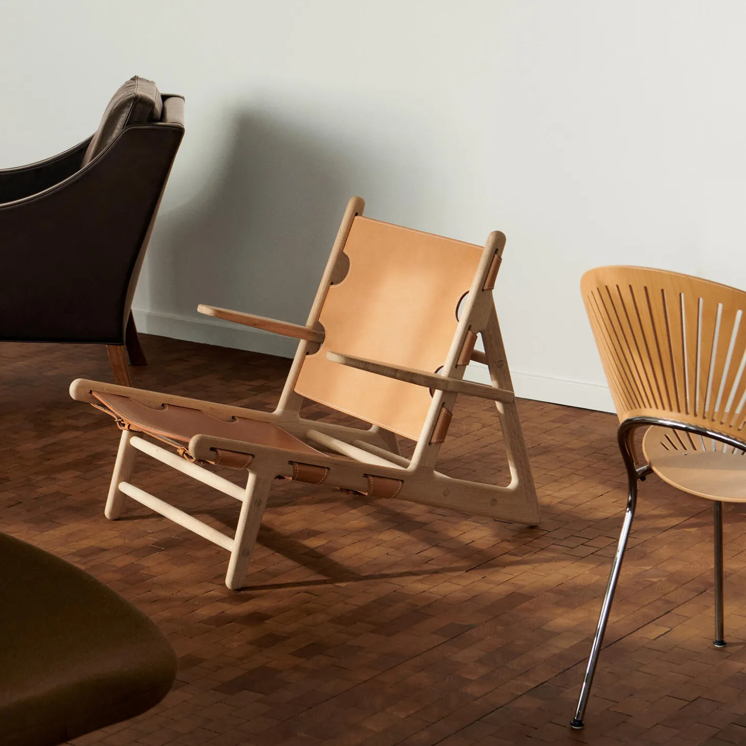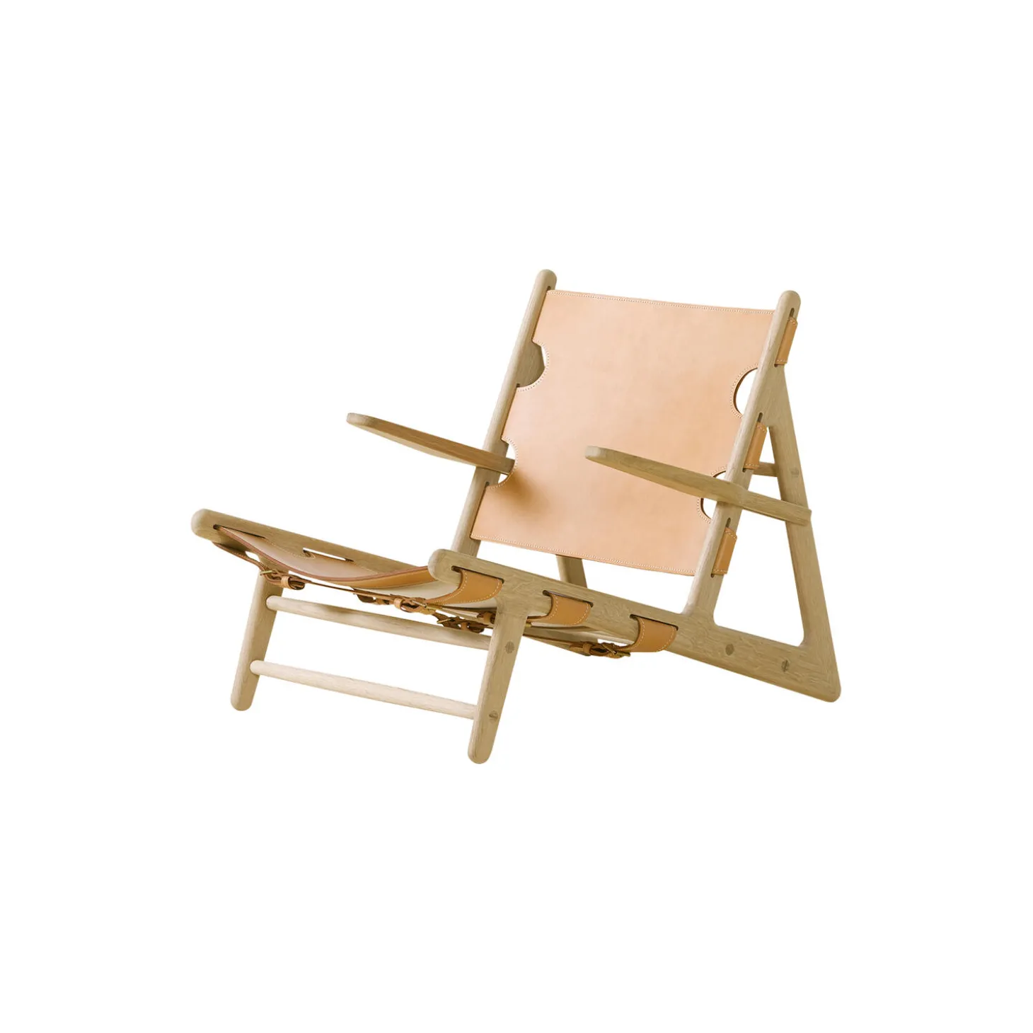 Jagtstolen model 2229 i sæbebehandlet eg og natur læder fra Fredericia. Mål: 67×70,5×87 cm. SH: 28 cm. Design: Børge Mogensen. Fås også i andre farver, størrelser og stofversioner.
