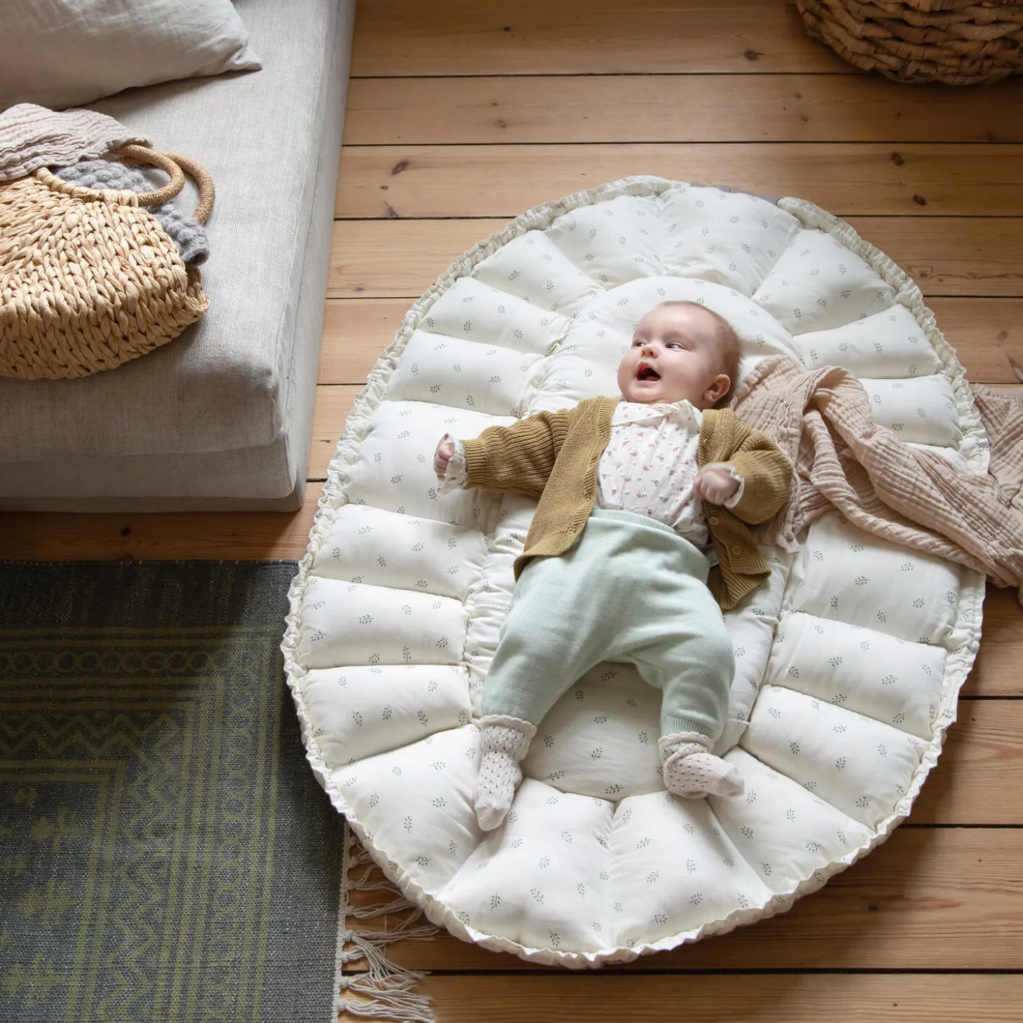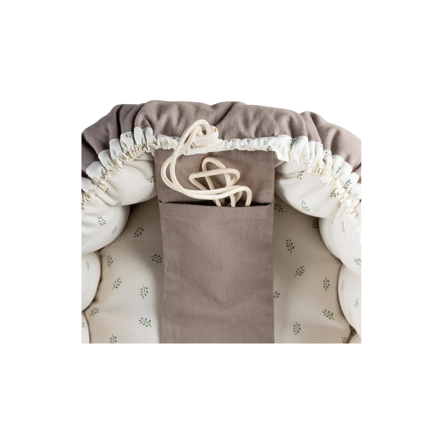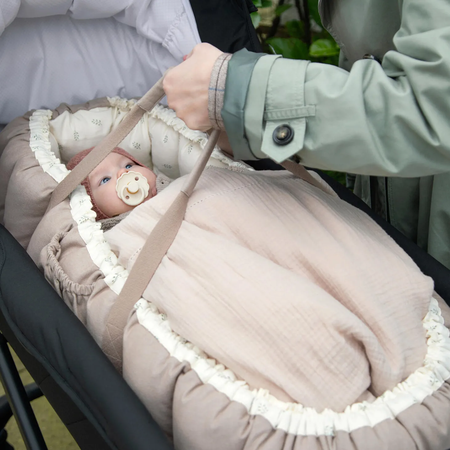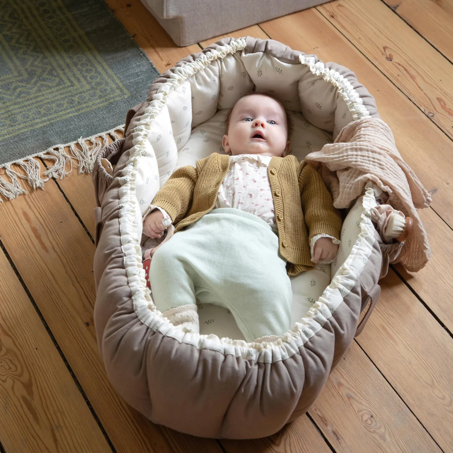 Lad dit barn ligge trygt og sikkert i den blødeste rede, der fungerer som lift, hvis I er på farten og som et stort legetæppe, når du nemt løsner babynestens sider. Den komfortable babynest omfavner din baby og skaber en tryg, velkendt base.
