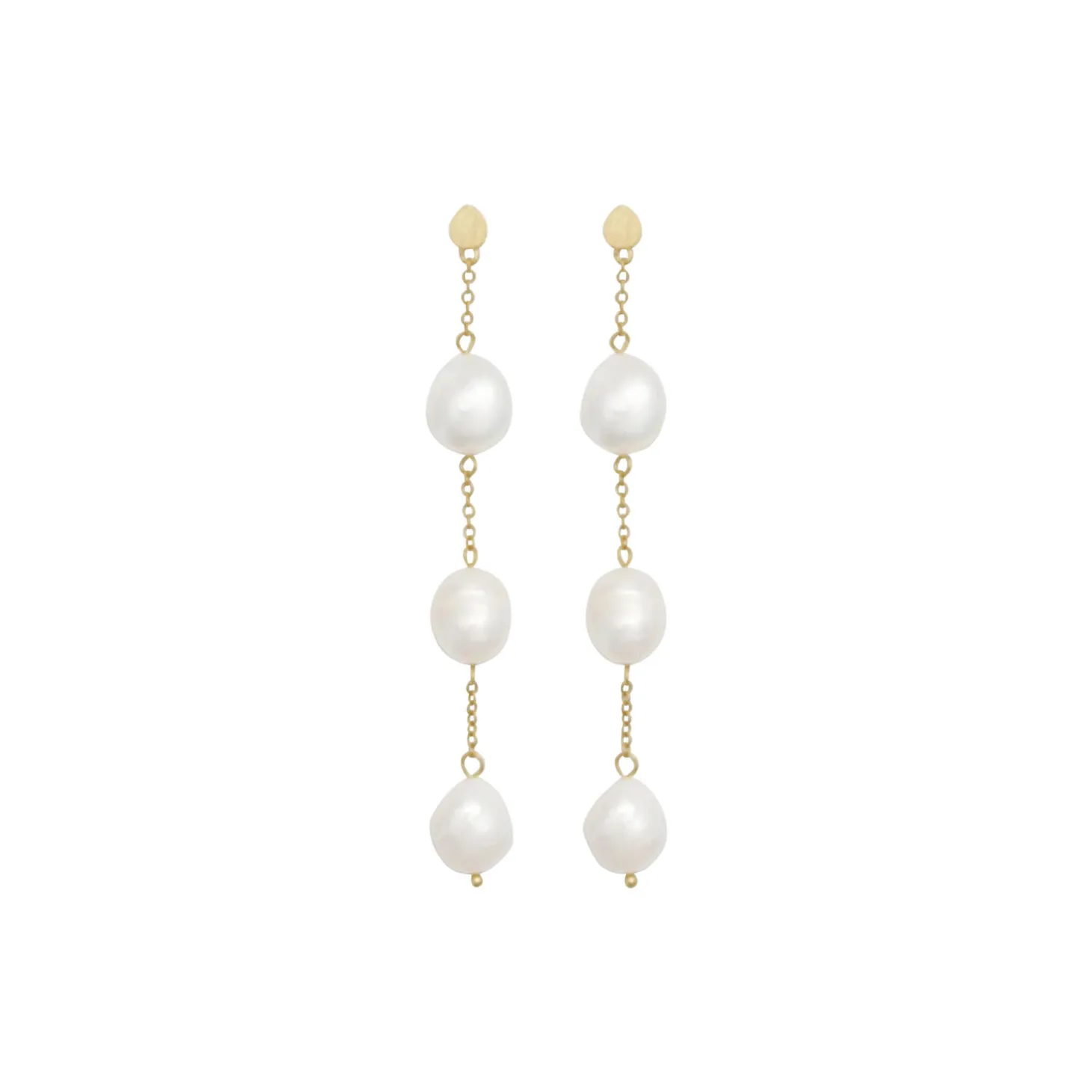 Mød vores 3 pearls earchain. Bemærk prisen er for et sæt øreringe (2 stk.). 3 små kvalitets barok ferskvandsperler på en forgyldt 925 ørekæde.