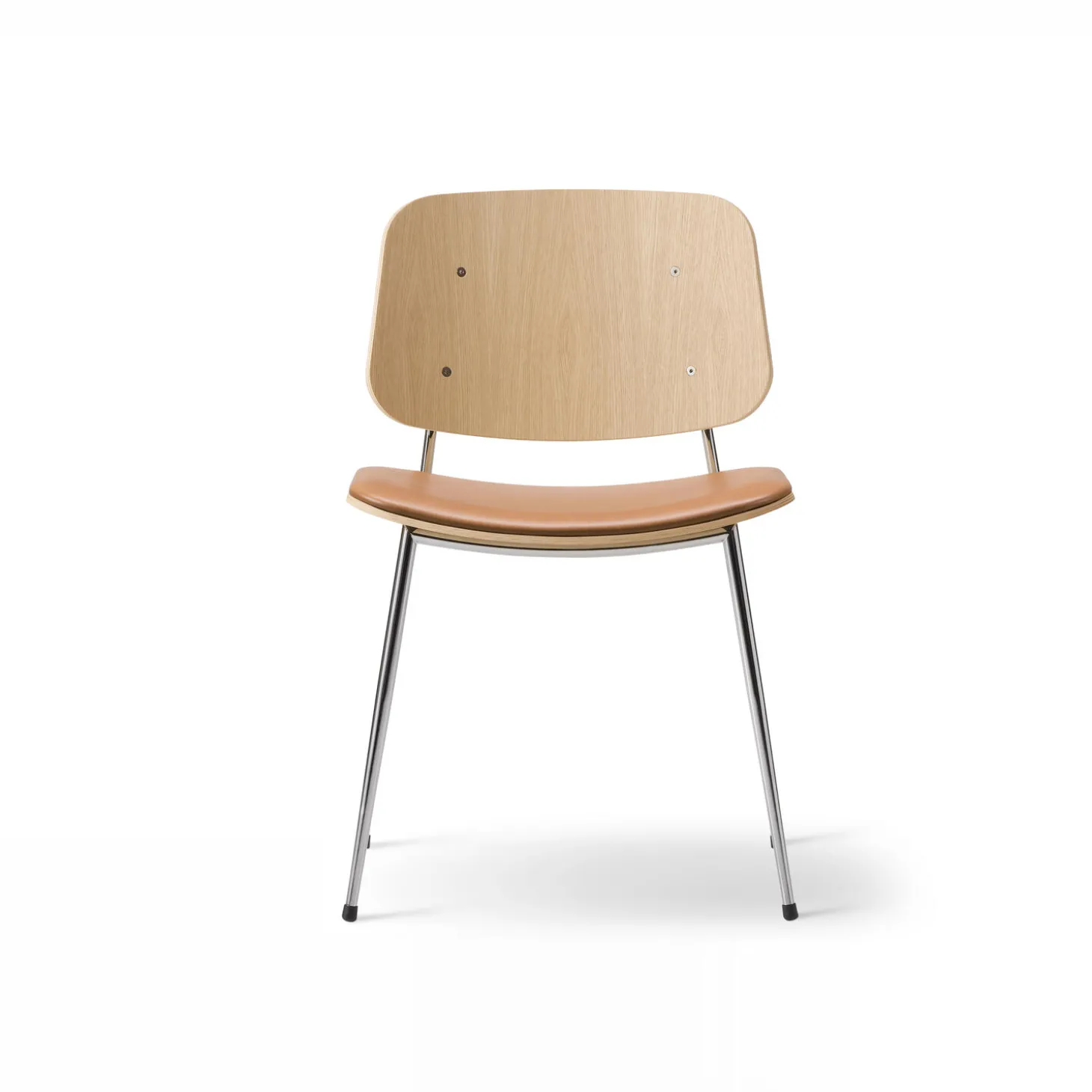 3061 Søborg spisebordsstol i lakeret eg med sædepolstring i natur anilinlæder 95 og stel i krom fra Fredericia. Farve: eg/cognac. Mål: H: 79,5 x B: 51 x D: 50,5 cm. Siddehøjde: 46,5 cm. Design: Børge Mogensen.