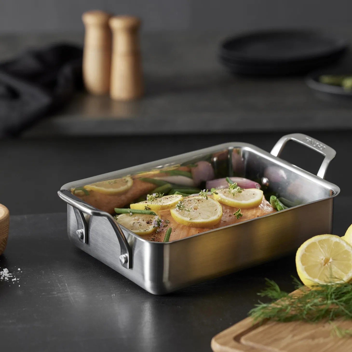 Bradepande af høj kvalitet i rustfrit stål med en tyk bund på 1 mm. De opretstående håndtag sikrer, at bradepanden er let at tage fat i og håndtere. Bradepanden måler 34,5 x 20 x 9 cm inkl. håndtag og er perfekt til mindre mængder mad.