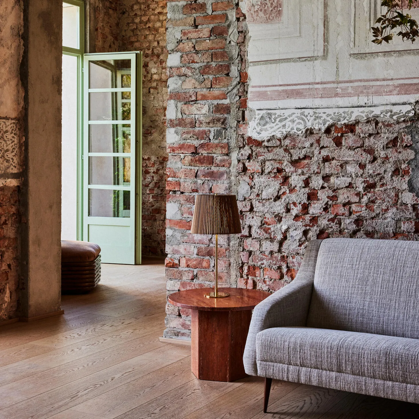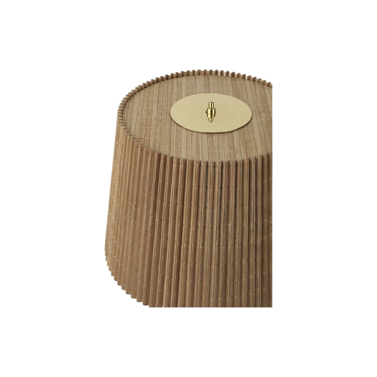 First produced around 1950, the 9205 is a classic, almost archetypal, table lamp with an unmistakable Tynell aesthetic. Elegant and slender, the lamp’s apparently simple form conceals an extraordinary degree of craftsmanship and highly skilled hand-making. The canvas model’s shade is constructed by attaching the fabric to a liner, which is then manually fixed onto a wire frame, while the bamboo is made from a series of slats first sewn together by hand to form a pleated mat before being connected to the liner and frame – a contemporary update to the ryegrass cane used in Taito’s original model. The stem is milled with a rattan-like pattern, created by a metalsmith using a lathe with great precision and attention to detail to mimic the effect of a series of overlapping strips. A brass plate, screwed into the stem, keeps the shade in place.