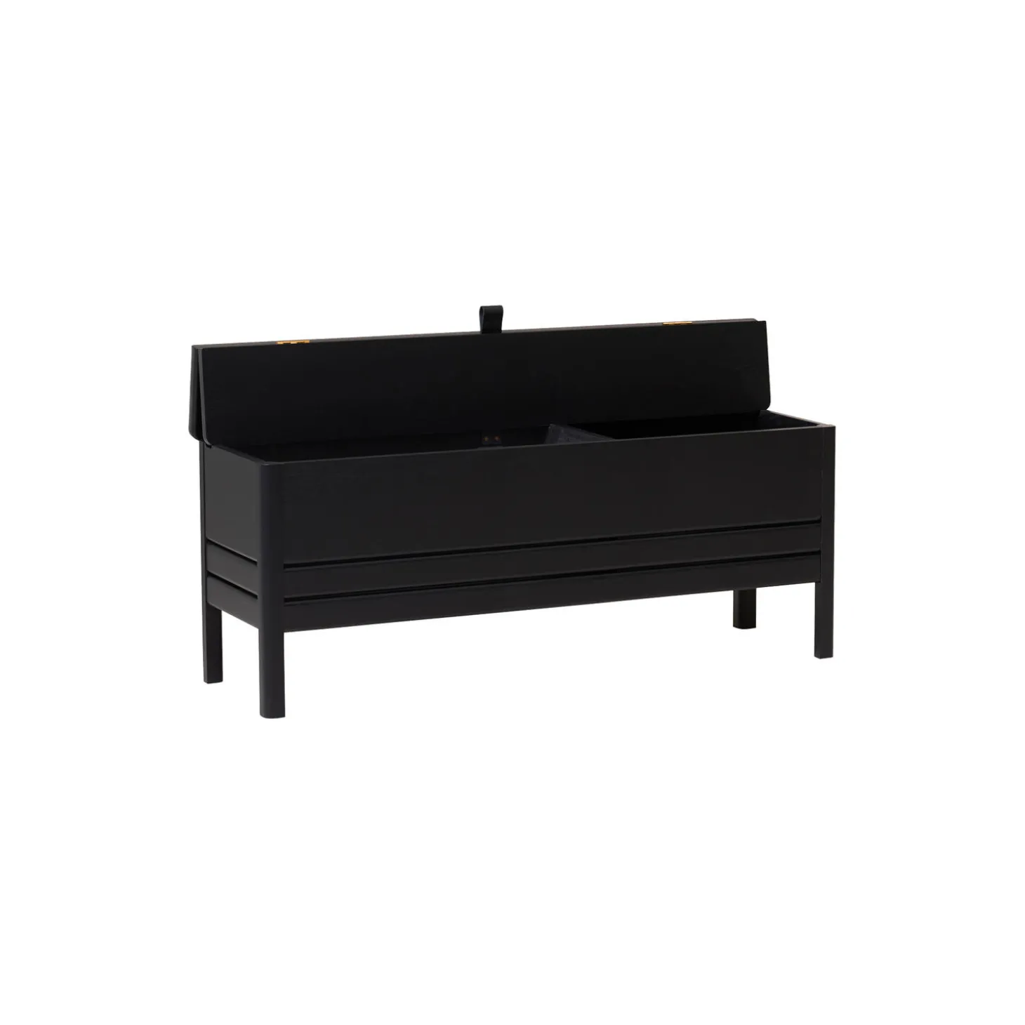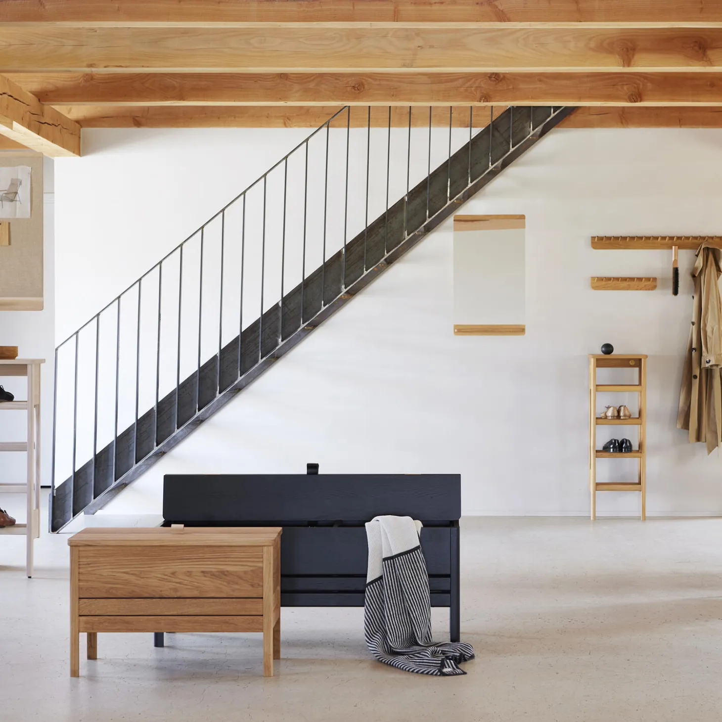 En opdateret version af den klassiske slagbænk, hvor form og funktion mødes. En solid og alsidig bænk med lettere, mere reducerede dimensioner og et minimalistisk udtryk. Den har et praktisk stort opbevaringsrum, inddelt i to sektioner. Låget løftes med et lædergreb, og konstruktionen holder låget i spænd under brug. Benenes længde og vinklerne giver slagbænken en luftig fornemmelse, mens designet som helhed er solid og robust.En alsidig bænk, der kan stå alene i en entre, i et soveværelse eller indgå i et siddearrangement. Kommer i eg og sortbejdset eg.Bænken passer til 3 personer og kan tage en vægt på 250 kg