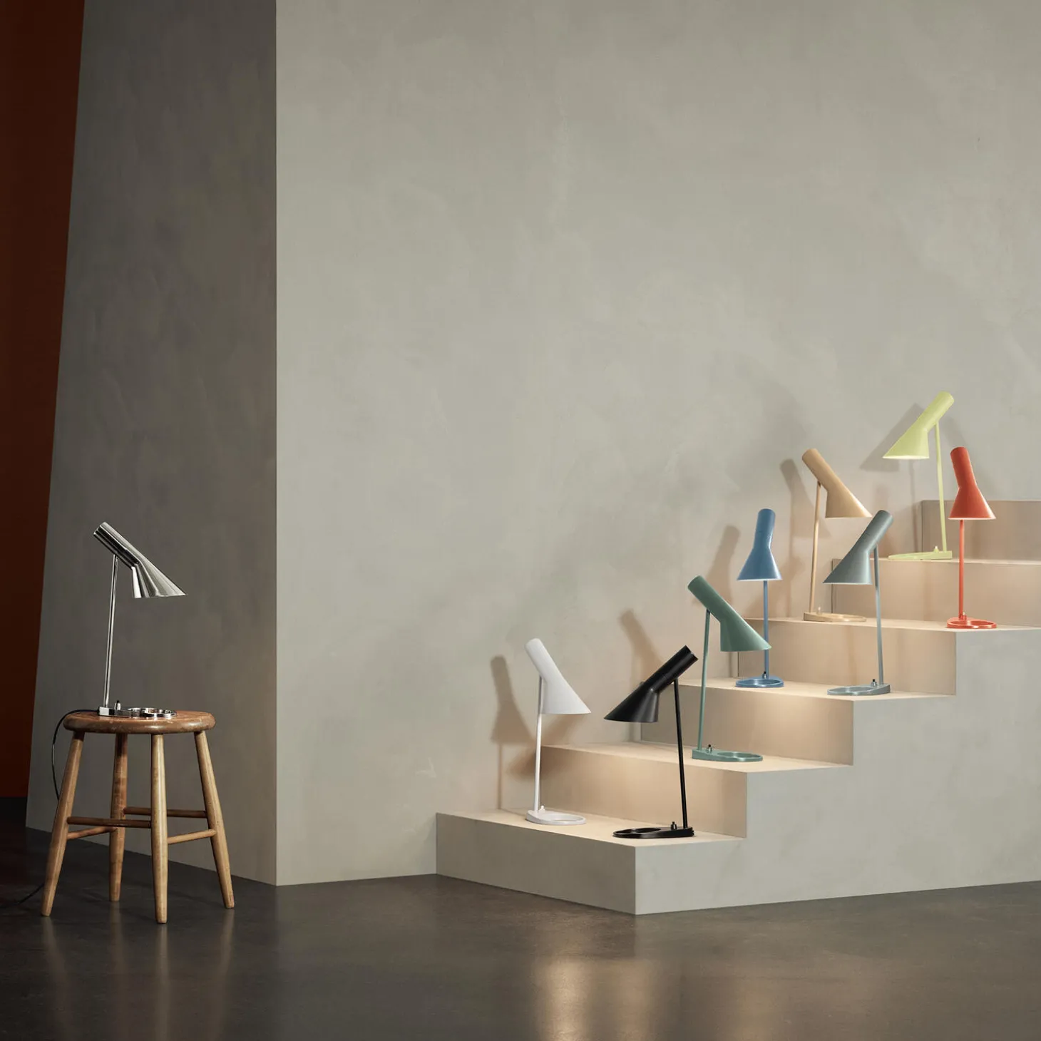 AJ lampen er designet i 1957 til SAS Royal Hotel i København og er et ikonisk design af Arne Jacobsen. Designet er grafisk og rent i sit udtryk, hvilket giver et tidløst look, der passer ind i forskellige farvepaletter, som er afstemt med moderne indretningstrends. AJ bordlampen giver nedadrettet lys, og skærmens vinkel kan justeres, så den passer til brugerens behov. Farven er malet hvid på indersiden, hvilket giver et ensartet, blødt lys.