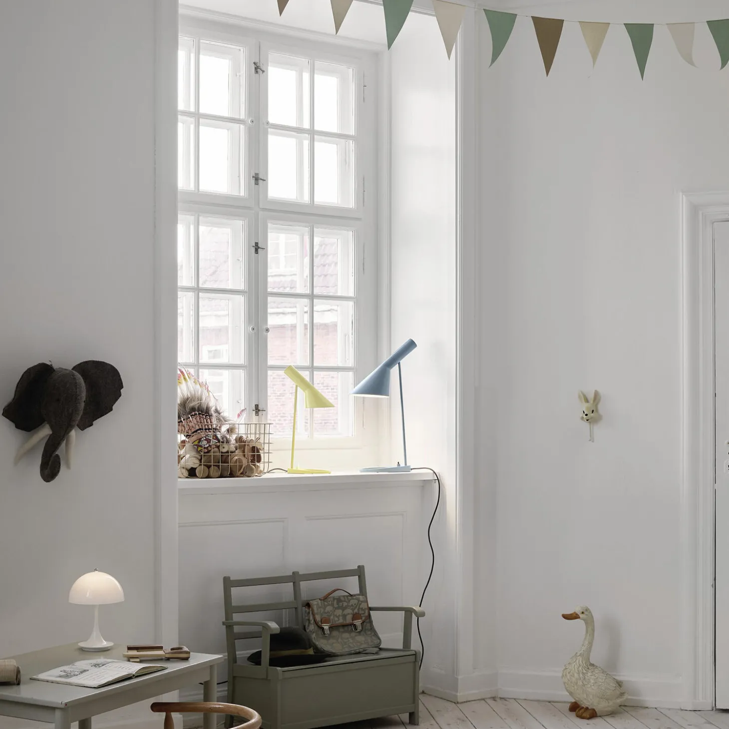 AJ lampen er designet i 1957 til SAS Royal Hotel i København og er et ikonisk design af Arne Jacobsen. Designet er grafisk og rent i sit udtryk, hvilket giver et tidløst look, der passer ind i forskellige farvepaletter, som er afstemt med moderne indretningstrends. AJ bordlampen giver nedadrettet lys, og skærmens vinkel kan justeres, så den passer til brugerens behov. Farven er malet hvid på indersiden, hvilket giver et ensartet, blødt lys.