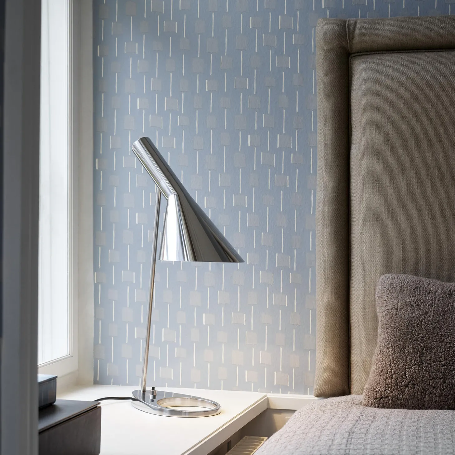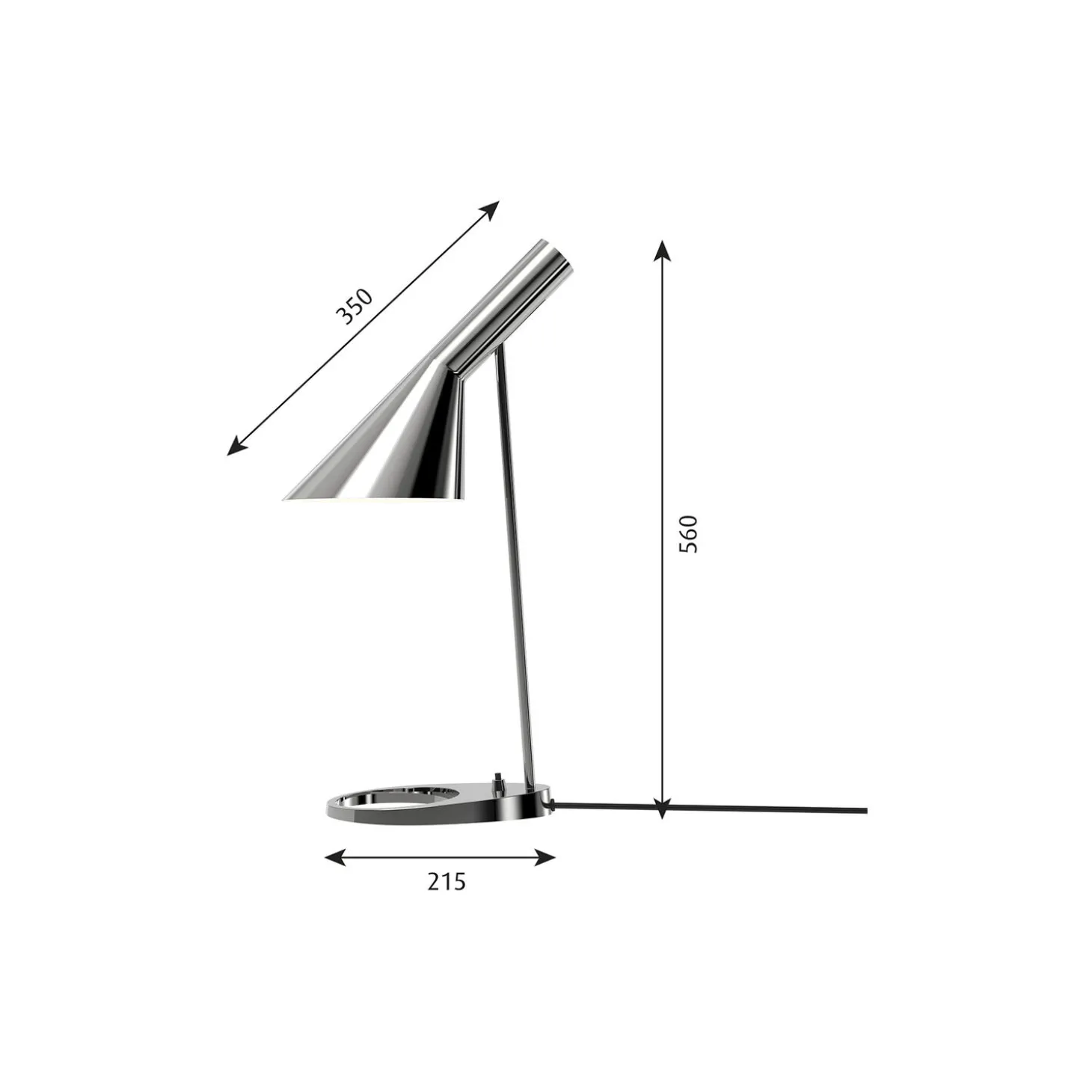AJ lampen er designet i 1957 til SAS Royal Hotel i København og er et ikonisk design af Arne Jacobsen. Designet er grafisk og rent i sit udtryk, hvilket giver et tidløst look, der passer ind i forskellige farvepaletter, som er afstemt med moderne indretningstrends. AJ bordlampen giver nedadrettet lys, og skærmens vinkel kan justeres, så den passer til brugerens behov. Farven er malet hvid på indersiden, hvilket giver et ensartet, blødt lys.
