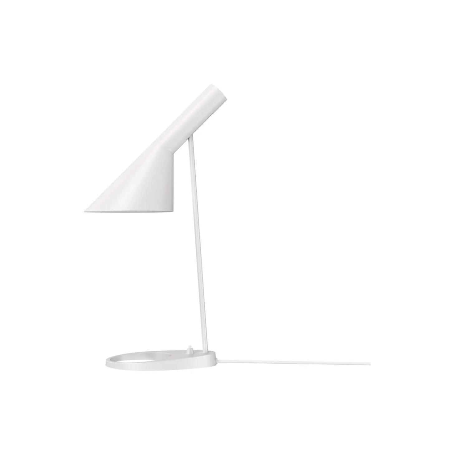 AJ lampen er designet i 1957 til SAS Royal Hotel i København og er et ikonisk design af Arne Jacobsen. Designet er grafisk og rent i sit udtryk, hvilket giver et tidløst look, der passer ind i forskellige farvepaletter, som er afstemt med moderne indretningstrends. AJ bordlampen giver nedadrettet lys, og skærmens vinkel kan justeres, så den passer til brugerens behov. Farven er malet hvid på indersiden, hvilket giver et ensartet, blødt lys.
