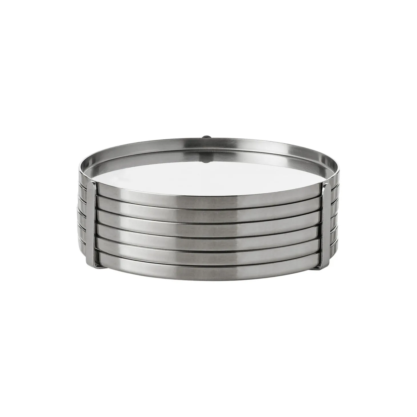 Arne Jacobsens glasbakker består af seks glasbakker og en diskret holder, som glasbakkerne kan stables på, når de ikke er i brug. Glasbakkerne er i rustfrit stål og har en diameter på 8,5 cm. Med Arne Jacobsens glasbakker fra Cylinda-line serien undgås dryp og glasaftegninger på bordet.