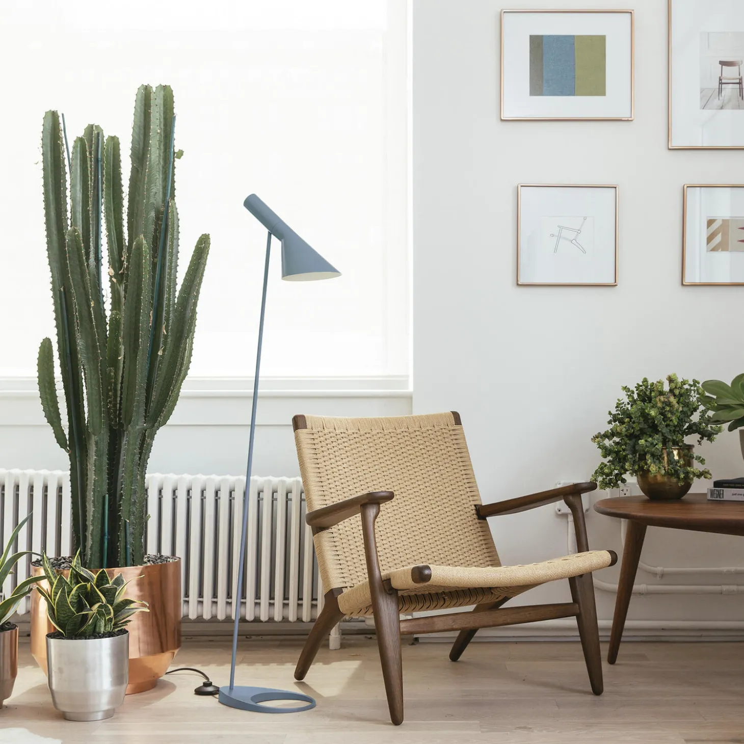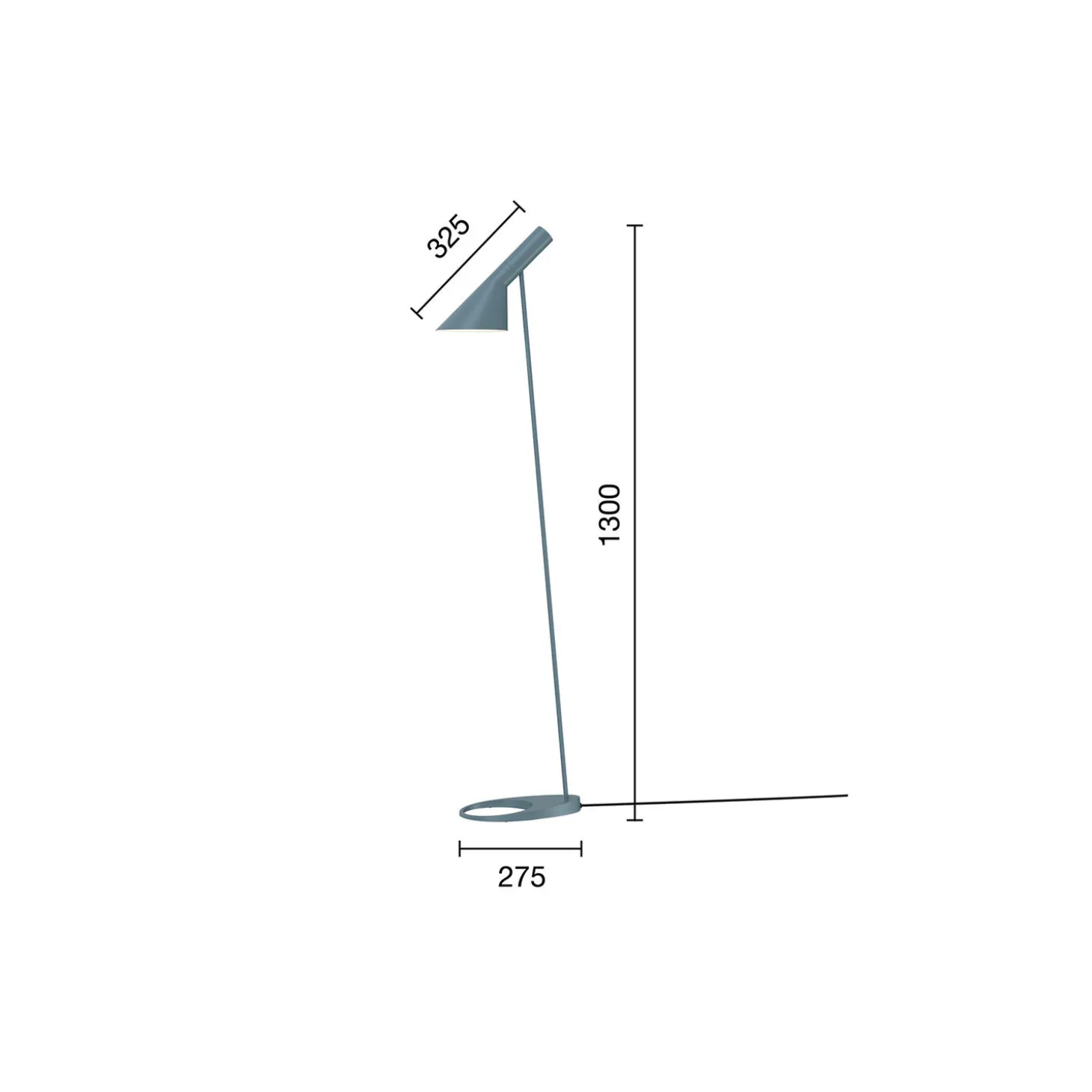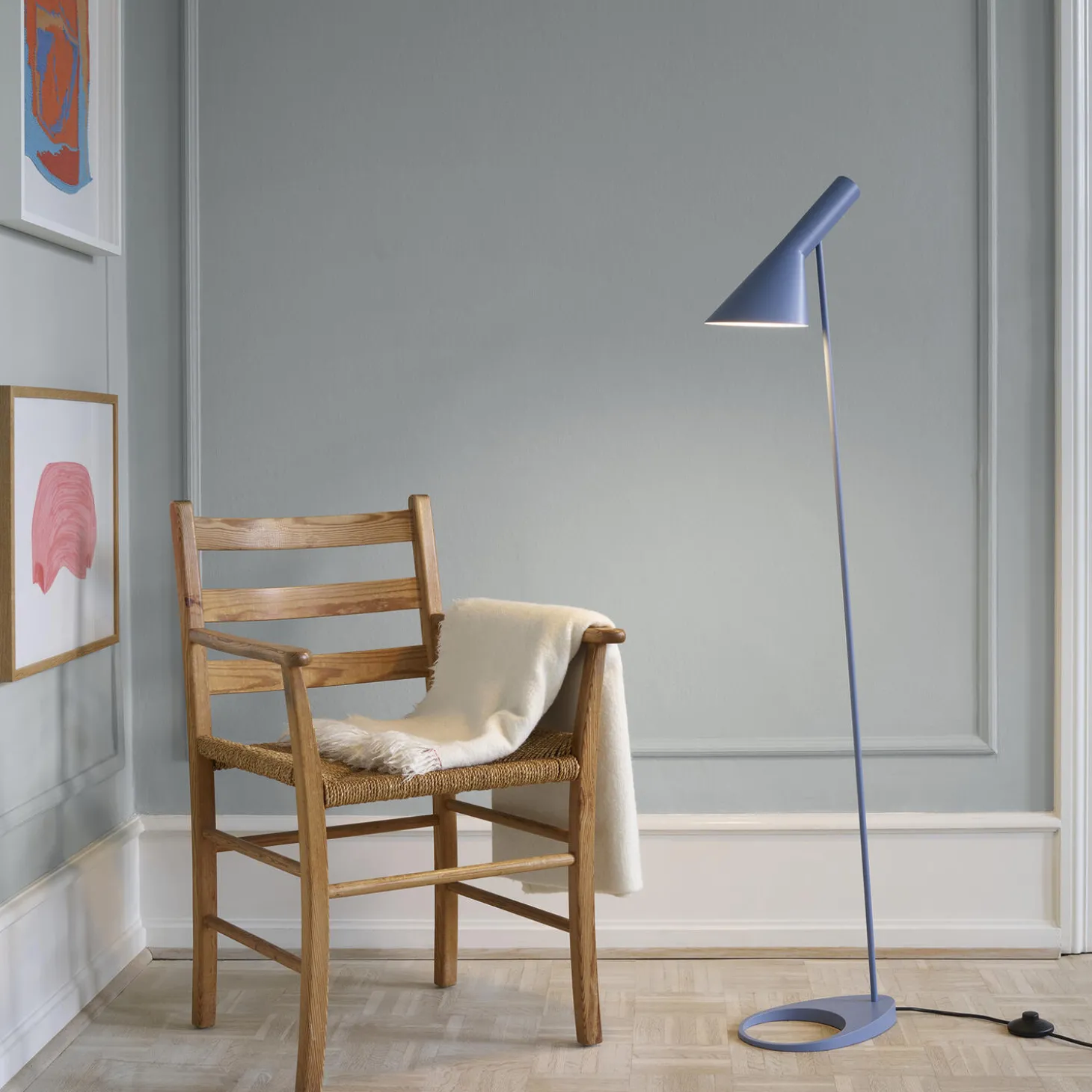 AJ lampen er designet i 1957 til SAS Royal Hotel i København og er et ikonisk design af Arne Jacobsen. Designet er grafisk og rent i sit udtryk, hvilket giver et tidløst look, der passer ind i forskellige farvepaletter, som er afstemt med moderne indretningstrends. AJ gulvlampen giver et nedadrettet lys, og skærmens vinkel kan justeres, så den passer til brugerens behov. Farven er malet hvid på indersiden, hvilket giver et ensartet, blødt lys.