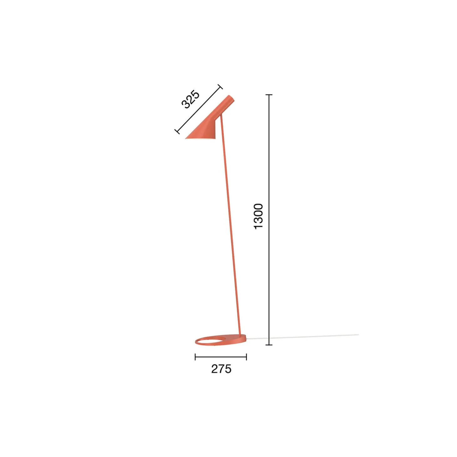 AJ lampen er designet i 1957 til SAS Royal Hotel i København og er et ikonisk design af Arne Jacobsen. Designet er grafisk og rent i sit udtryk, hvilket giver et tidløst look, der passer ind i forskellige farvepaletter, som er afstemt med moderne indretningstrends. AJ gulvlampen giver et nedadrettet lys, og skærmens vinkel kan justeres, så den passer til brugerens behov. Farven er malet hvid på indersiden, hvilket giver et ensartet, blødt lys.