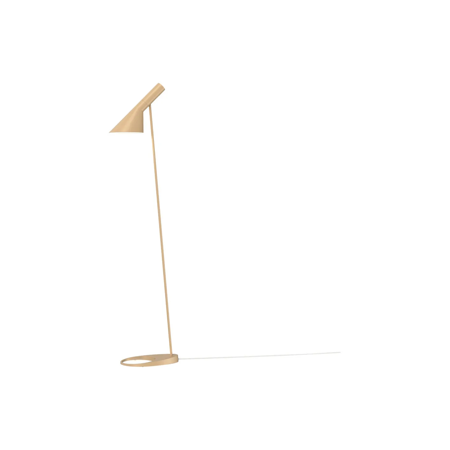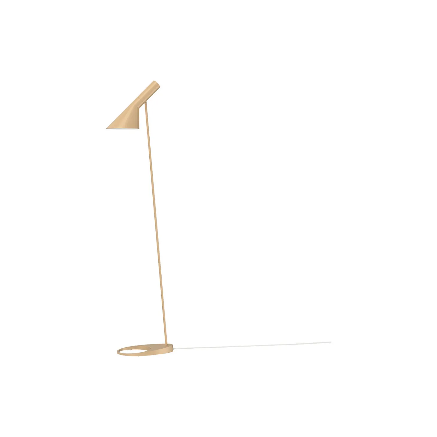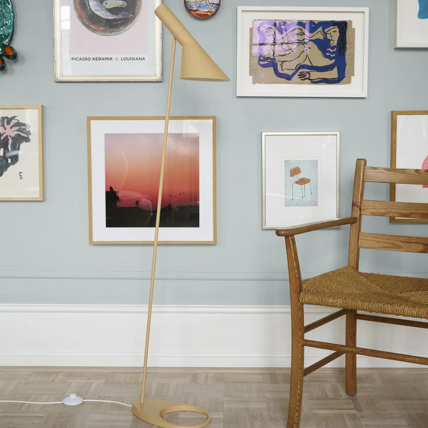 AJ lampen er designet i 1957 til SAS Royal Hotel i København og er et ikonisk design af Arne Jacobsen. Designet er grafisk og rent i sit udtryk, hvilket giver et tidløst look, der passer ind i forskellige farvepaletter, som er afstemt med moderne indretningstrends. AJ gulvlampen giver et nedadrettet lys, og skærmens vinkel kan justeres, så den passer til brugerens behov. Farven er malet hvid på indersiden, hvilket giver et ensartet, blødt lys.