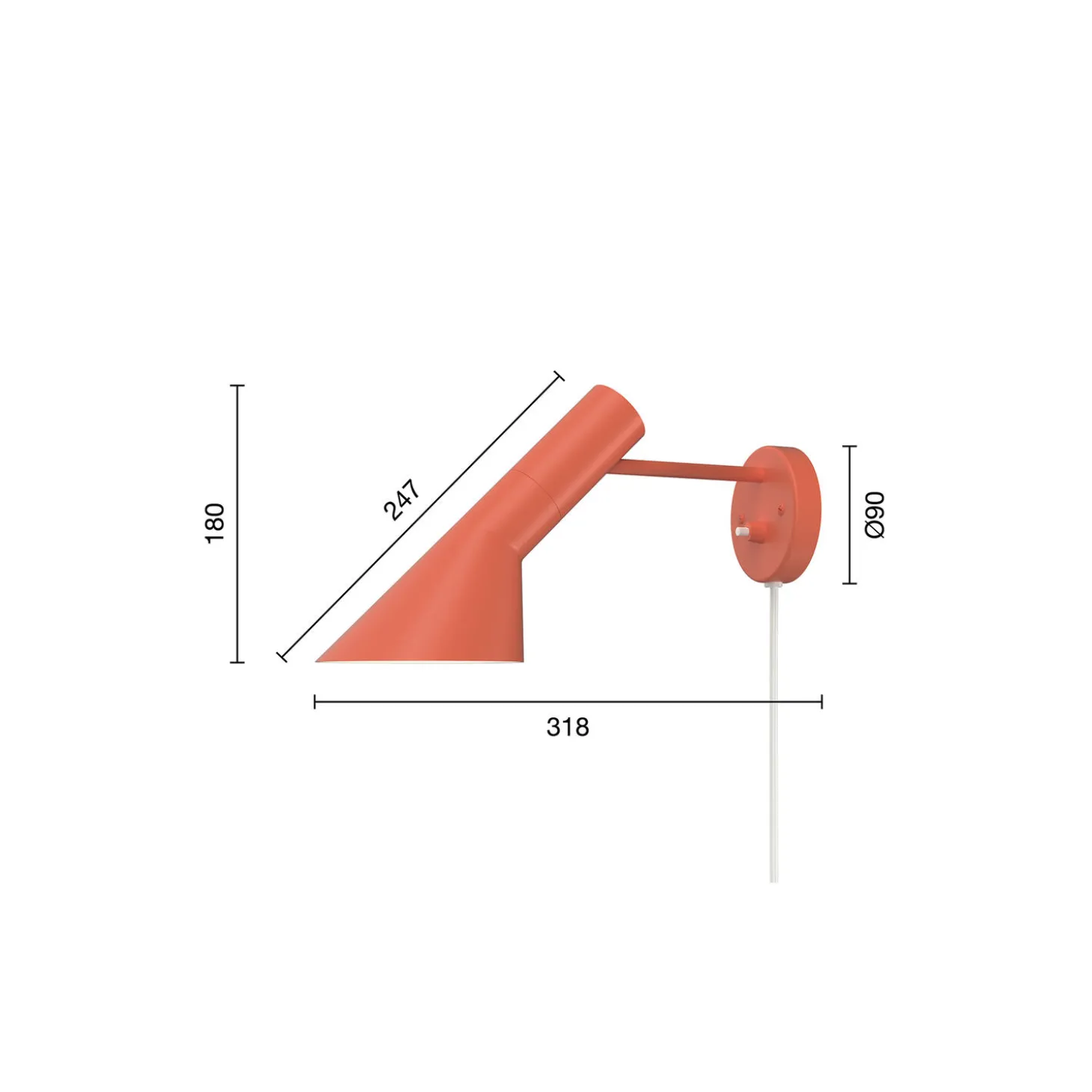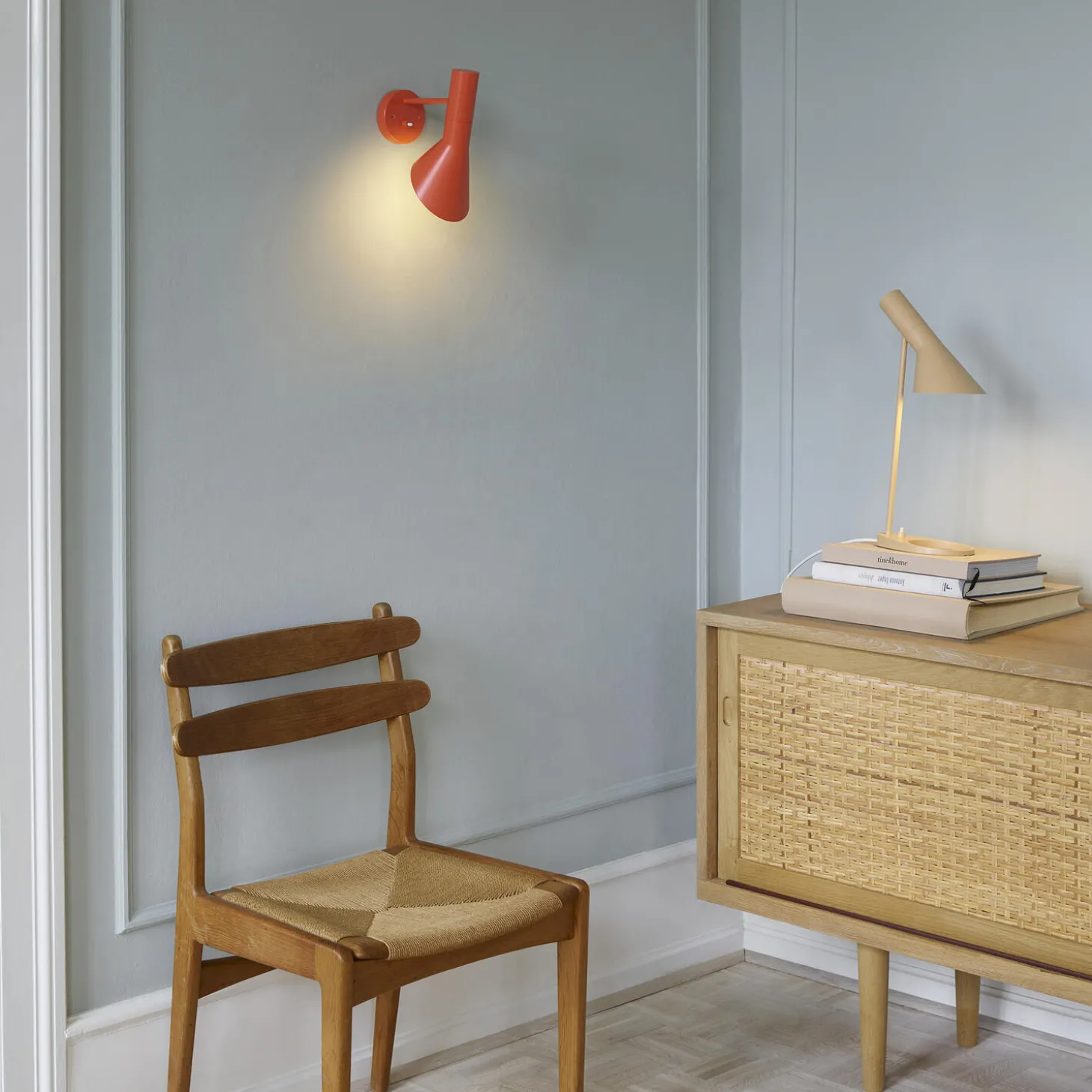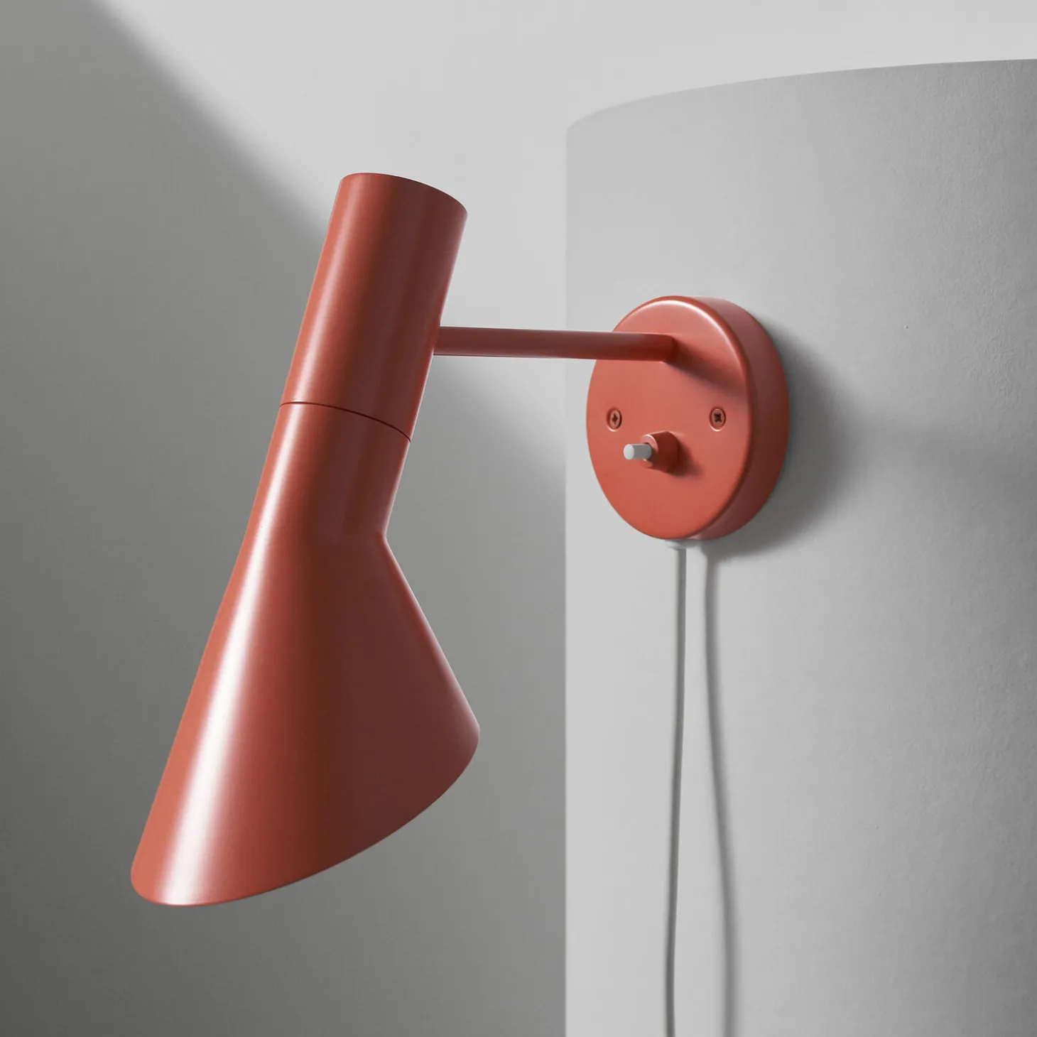 AJ lampen er designet i 1957 til SAS Royal Hotel i København og er et ikonisk design af Arne Jacobsen. Designet er grafisk og rent i sit udtryk, hvilket giver et tidløst look, der passer ind i forskellige farvepaletter, som er afstemt med moderne indretningstrends. AJ væglampen giver et nedadrettet lys, og skærmens vinkel kan justeres, så den passer til brugerens behov. Farven er malet hvid på indersiden, hvilket giver et ensartet, blødt lys.