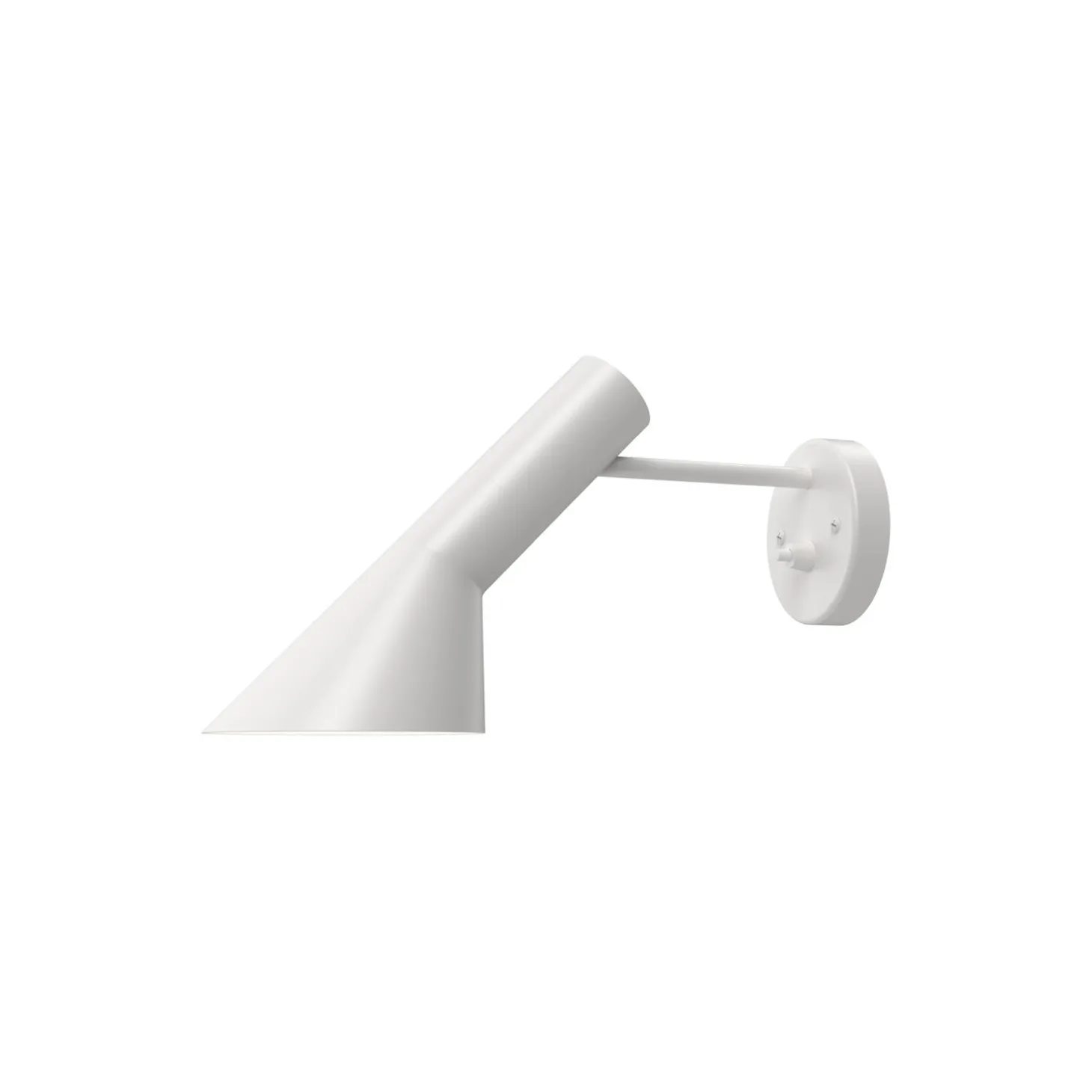 AJ væglampe uden ledning i vådlakeret optrukket stål fra Louis Poulsen. Farve: white. Mål: H: 18 x L: 31,8 x B: 14,5 cm. Lyskilde: maks. 20W E14. Design: Arne Jacobsen. Arne Jacobsen designede blandt meget andet dette armatur til SAS Royal Hotel i København i 1957. Væglampen giver et behageligt nedadrettet lys med sin hvidlakerede inderskærm. Desuden kan skærmen vippes for at justere lysfordelingen. AJ-lampefamilien anses for at være Arne Jacobsens mest kendte design på globalt plan. Bortset fra AJ Væg bestod AJ-familien også af en bordlampe, en mindre bordlampe, en gulvlampe samt en bordmonteret lampe, der alle kunne findes på SAS Royal Hotel efter indvielsen i 1960. AJ-lampens karakteristiske rene form med dens perfekte lys kunne ses rundt omkring på hotellet i versioner i både kobber og rustfrit stål. Sammen med AJ Royal var AJ-lampen en del af det overordnede designkoncept, som Arne Jacobsen skabte til hotellet. Han designede nærmest alt selv. Parallellerne mellem de lige linjer og kombinationen af lige og buede vinkler i AJ-lampen kan også ses i de geometriske konturer på flere af hans bygninger.