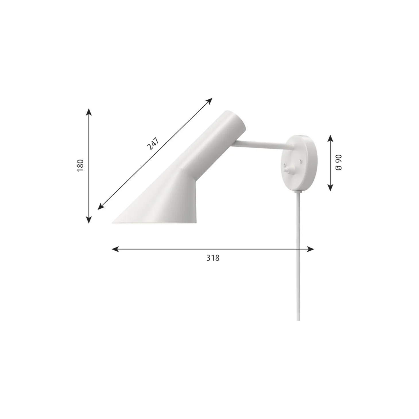 AJ lampen er designet i 1957 til SAS Royal Hotel i København og er et ikonisk design af Arne Jacobsen. Designet er grafisk og rent i sit udtryk, hvilket giver et tidløst look, der passer ind i forskellige farvepaletter, som er afstemt med moderne indretningstrends. AJ væglampen giver et nedadrettet lys, og skærmens vinkel kan justeres, så den passer til brugerens behov. Farven er malet hvid på indersiden, hvilket giver et ensartet, blødt lys.