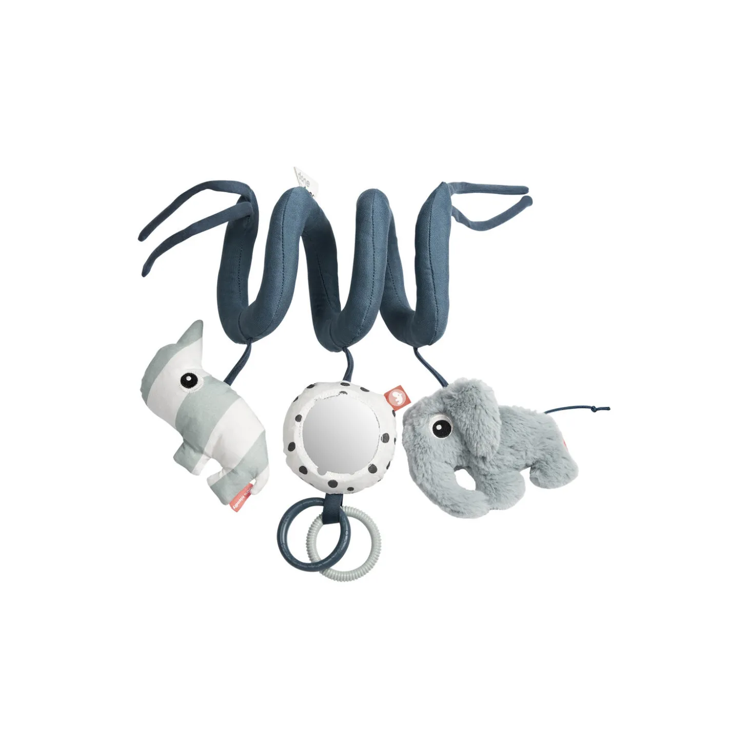 Aktivitetsspiral i 100% polyester og tøjdyr i 100% bomuld med fyld af polyesterfibre fra Done By Deer. Farve: blå. Mål: H: 20 x B: 15-33 x Ø 10 cm. Design: Done By Deer.