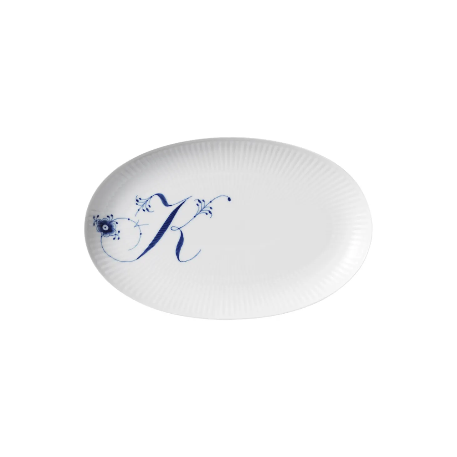 Alfabet tallerken K i porcelæn fra Royal Copenhagen. Det smukke ’K’ er håndmalet på denne ovale tallerken på 23,5 cm, som er et charmerende supplement til Alfabetkrusene. Brug den lille tallerken i en personlig opdækning og skab dit eget udtryk ved at kombinere den med andre steldele fra Royal Copenhagen.