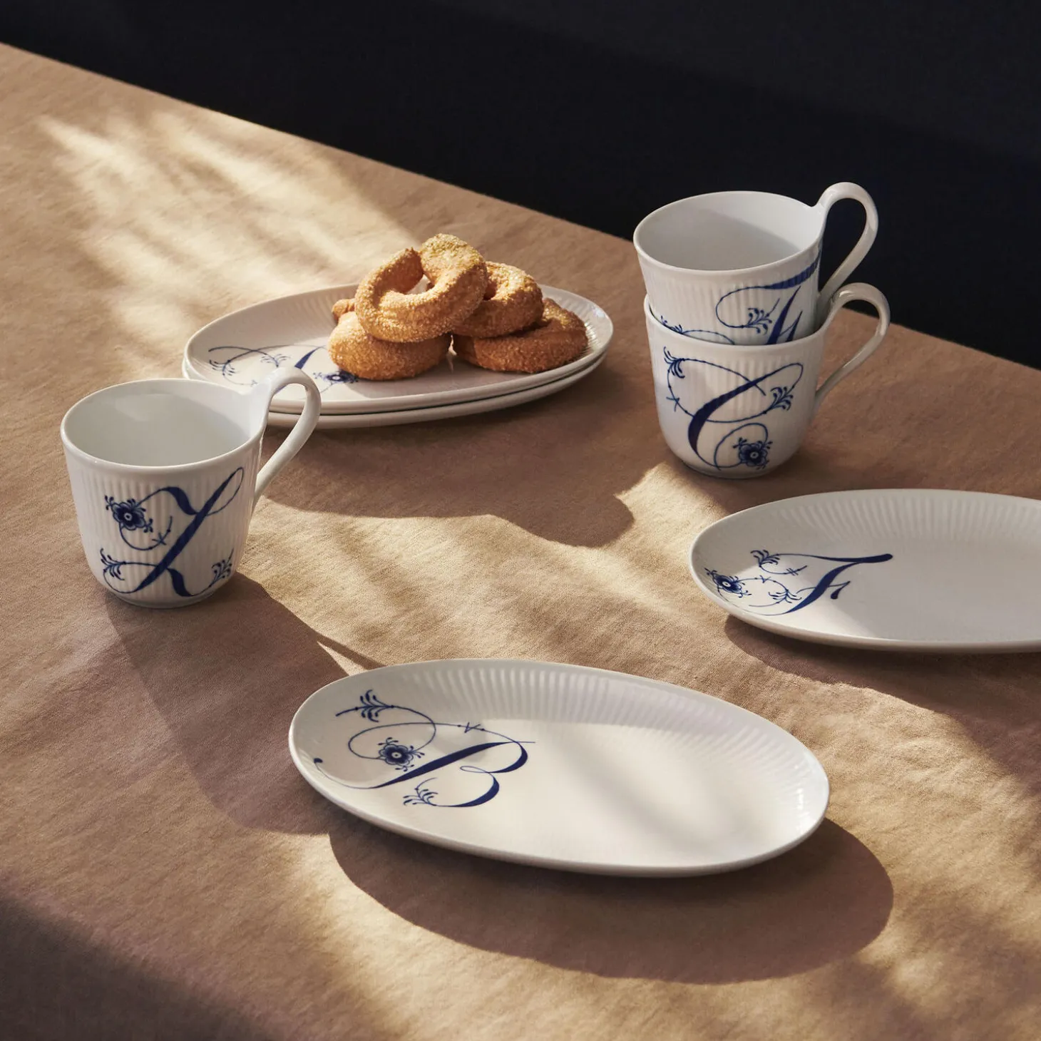 Alfabet tallerken W i porcelæn fra Royal Copenhagen. Det smukke ’W’ er håndmalet på denne ovale tallerken på 23,5 cm, som er et charmerende supplement til Alfabetkrusene. Brug den lille tallerken i en personlig opdækning og skab dit eget udtryk ved at kombinere den med andre steldele fra Royal Copenhagen.