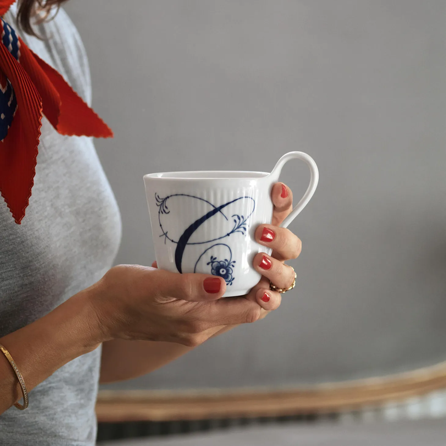 Alfabet krus C i porcelæn fra Royal Copenhagen. Det personlige Alfabet Krus på 33 cl prydes af et håndmalet C, hvorfra der vokser små palmetter og en stiliseret blomst. Drej koppen i hånden, og bagsiden åbenbarer sig med en delikat, blåmalet detalje af florale elementer, som bærer tydelige referencer til Musselmalet Riflet-mønsteret. Brug det charmerende krus til enhver slags varm drik.