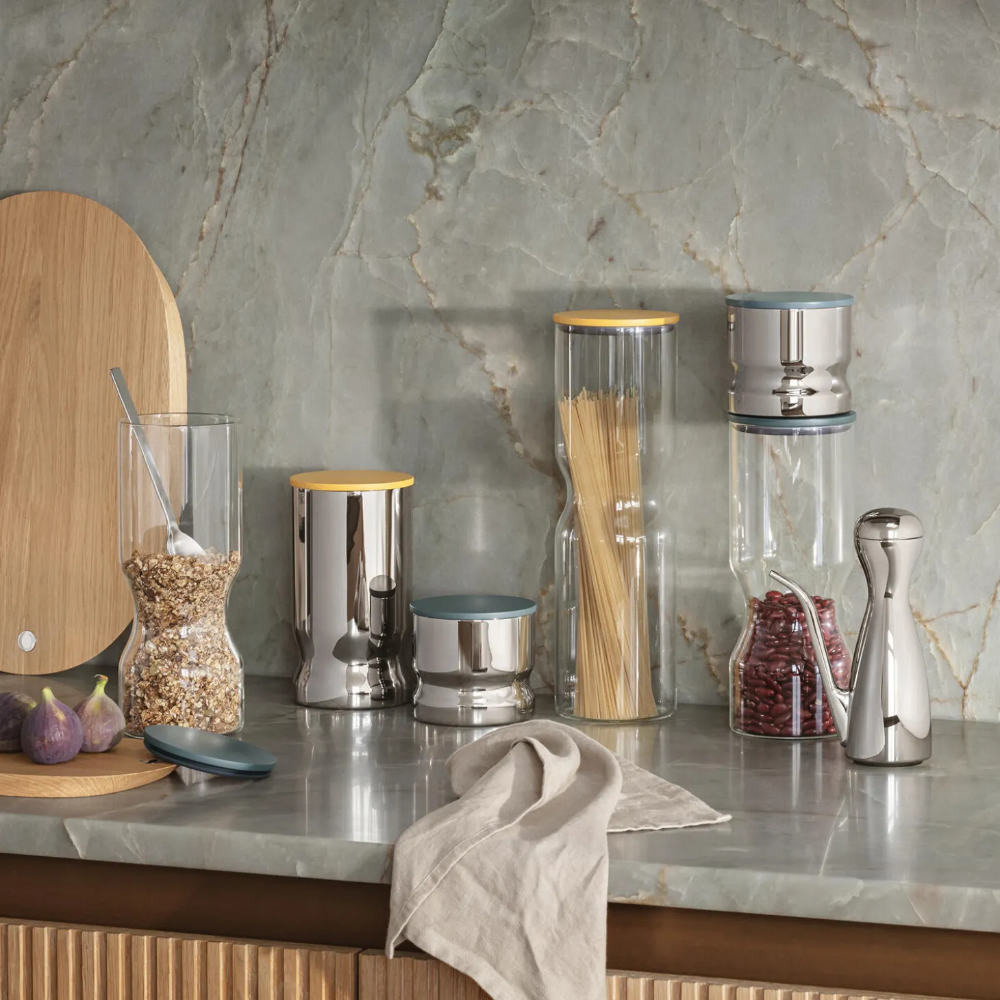 Ideelt til opbevaring af alt fra spaghetti til havregryn, mel og kaffe. Dette opbevaringsglas fra Alfredo kollektionen løfter stilen i ethvert køkken og er designet af Alfredo Häberli for Georg Jensen. Opbevaringsglasset har et gult låg i rustfrit stål, som er lufttæt og sørger for, at maden hele tiden holder sig frisk. Vær opmærksom på, at opbevaringsglasset ikke er egnet til opvaskemaskine.