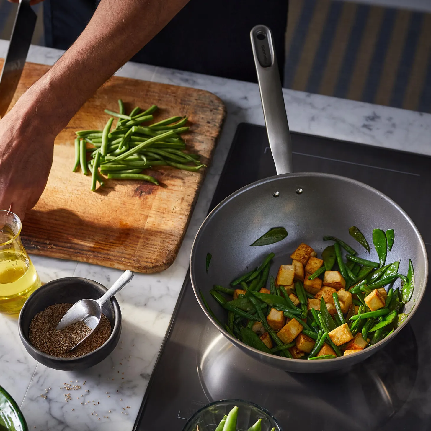 Fiskars All Steel wok 28 cm giver madlavningen et løft med genanvendt rustfrit stål i høj kvalitet, som minimerer affaldsmængden. Panden er fremstillet af 90 % genanvendt stål med 92 % lavere CO2 udledning end gennemsnittet i branchen og er utrolig holdbar. Takket være dens non-stick Ceratec™ belægning, der giver en fin stegeskorpe og kan bruges ved høje temperaturer, er du sikker på at opnå perfekte stegeresultater. Den tykke 3-lags bund er optimeret til effektiv og jævn varmefordeling på alle typer kogezoner. Pandens tidløse, simple udtryk passer godt ind i det moderne, bæredygtige køkken og gør hvert måltid til en god oplevelse. Fremstillet i Finland med bæredygtige processer og produktionsmetoder.