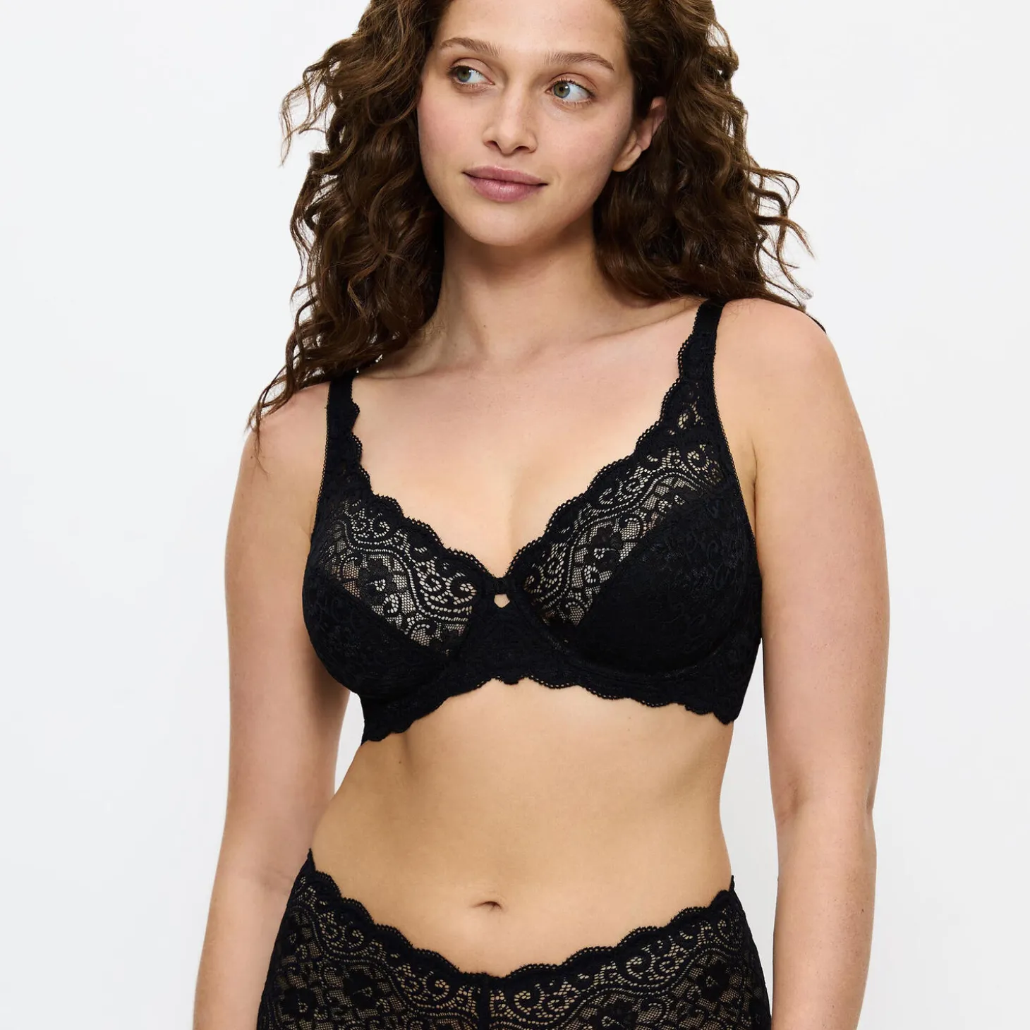 Bøjle-bh med ny elastisk skulderstrop: Nyt blødt Jacquard-design. Nyt bøjle-for: Blødt, glat og moderne. Ny blød hægtelukning med 4 rækker. Nye V-glidere for ekstra komfort og støtte.