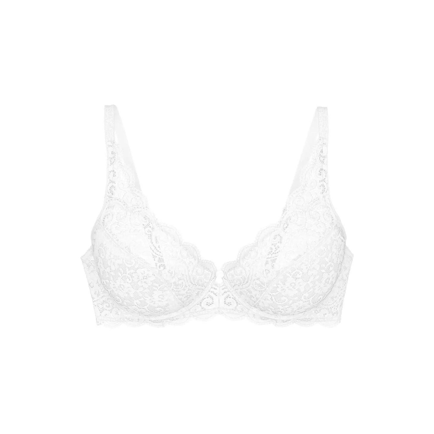 Bøjle-bh med ny elastisk skulderstrop: Nyt blødt Jacquard-design. Nyt bøjle-for: Blødt, glat og moderne. Ny blød hægtelukning med 4 rækker. Nye V-glidere for ekstra komfort og støtte.