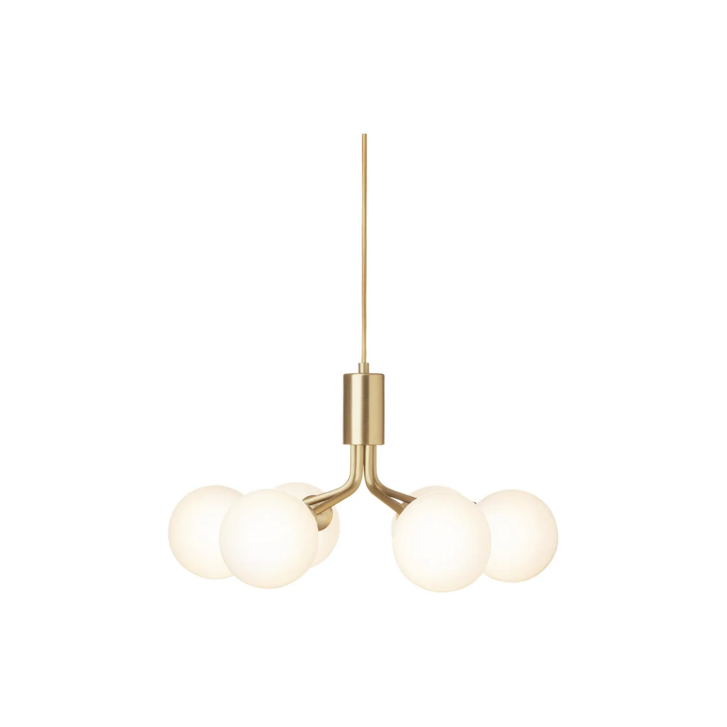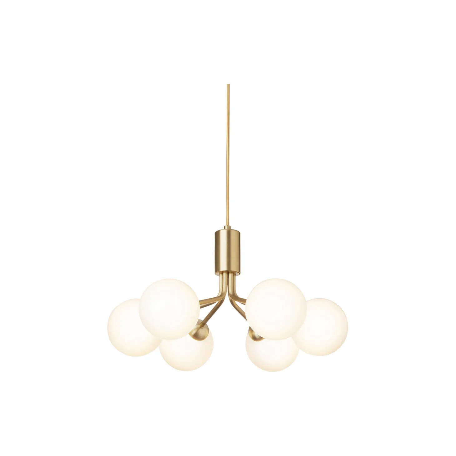 Apiales 6 er en hybrid mellem lysekronerne og de enkle pendler fra Apiales kollektionen. Med inspiration fra blomster udfolder Apiales 6 sine børstede messingarme og skyder knop med opalhvide glaskupler, der spreder et behageligt lys. Kombinationen af det bløde udtryk fra det gyldne metal og den rene form på de hvide, mundblæste glas giver denne Apiales lampe et yndefuldt look.