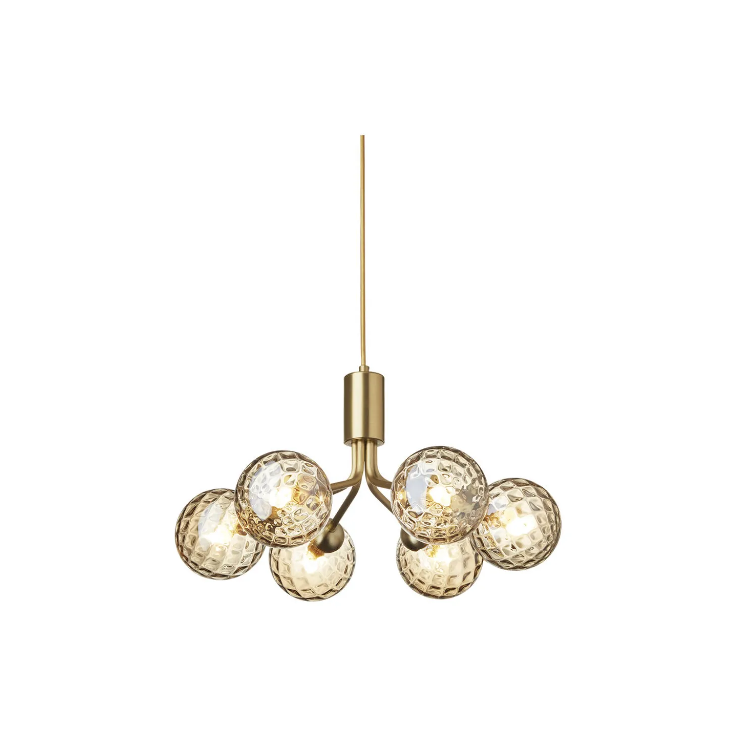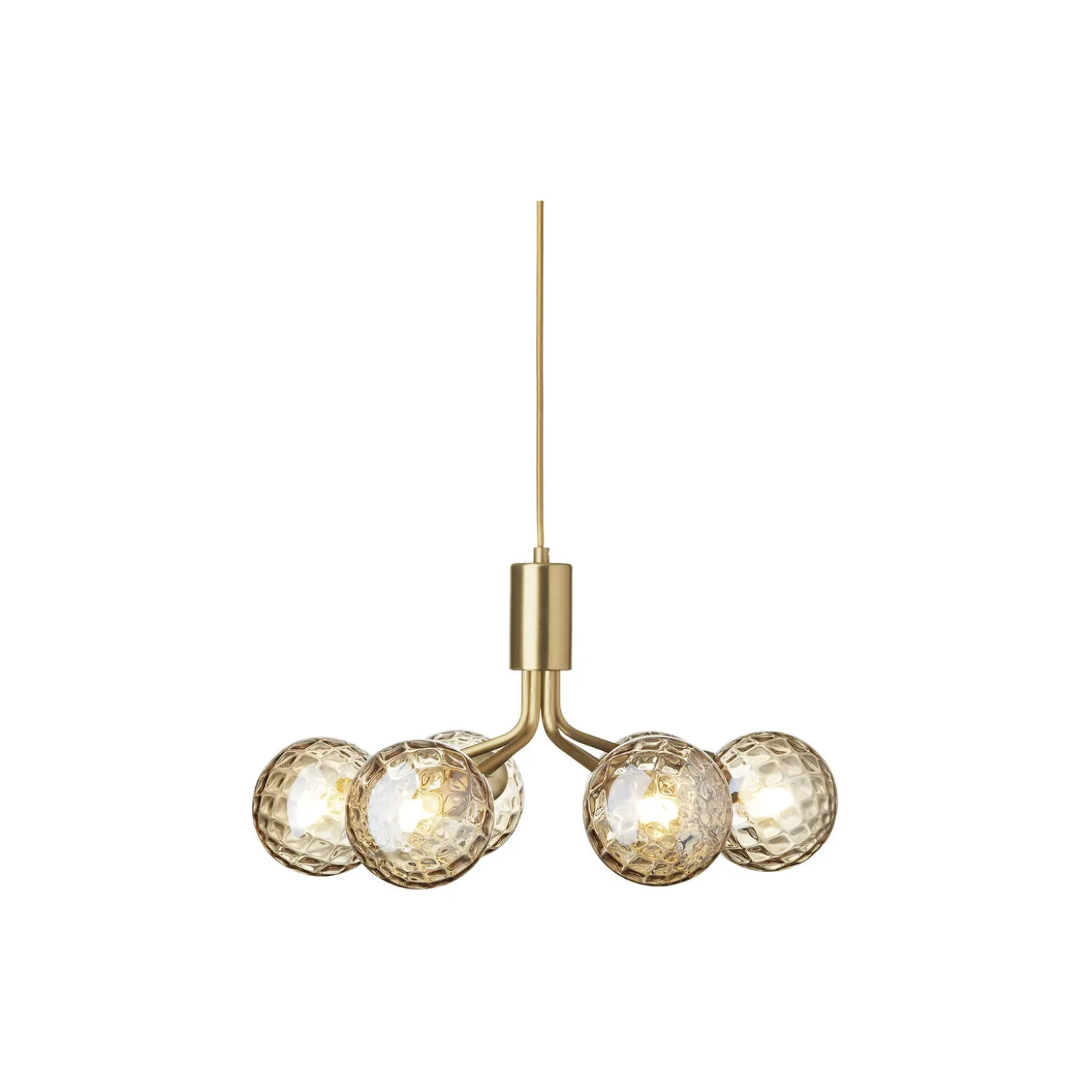 Apiales 6 er en hybrid mellem lysekronerne og de enkle pendler fra Apiales kollektionen. Med inspiration fra blomster udfolder Apiales 6 sine børstede messingarme og skyder knop med opalhvide glaskupler, der spreder et behageligt lys. Kombinationen af det bløde udtryk fra det gyldne metal og den rene form på de hvide, mundblæste glas giver denne Apiales lampe et yndefuldt look.