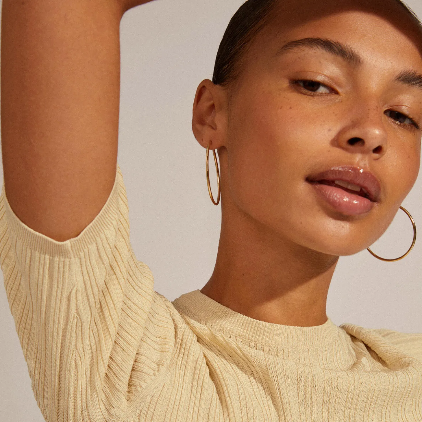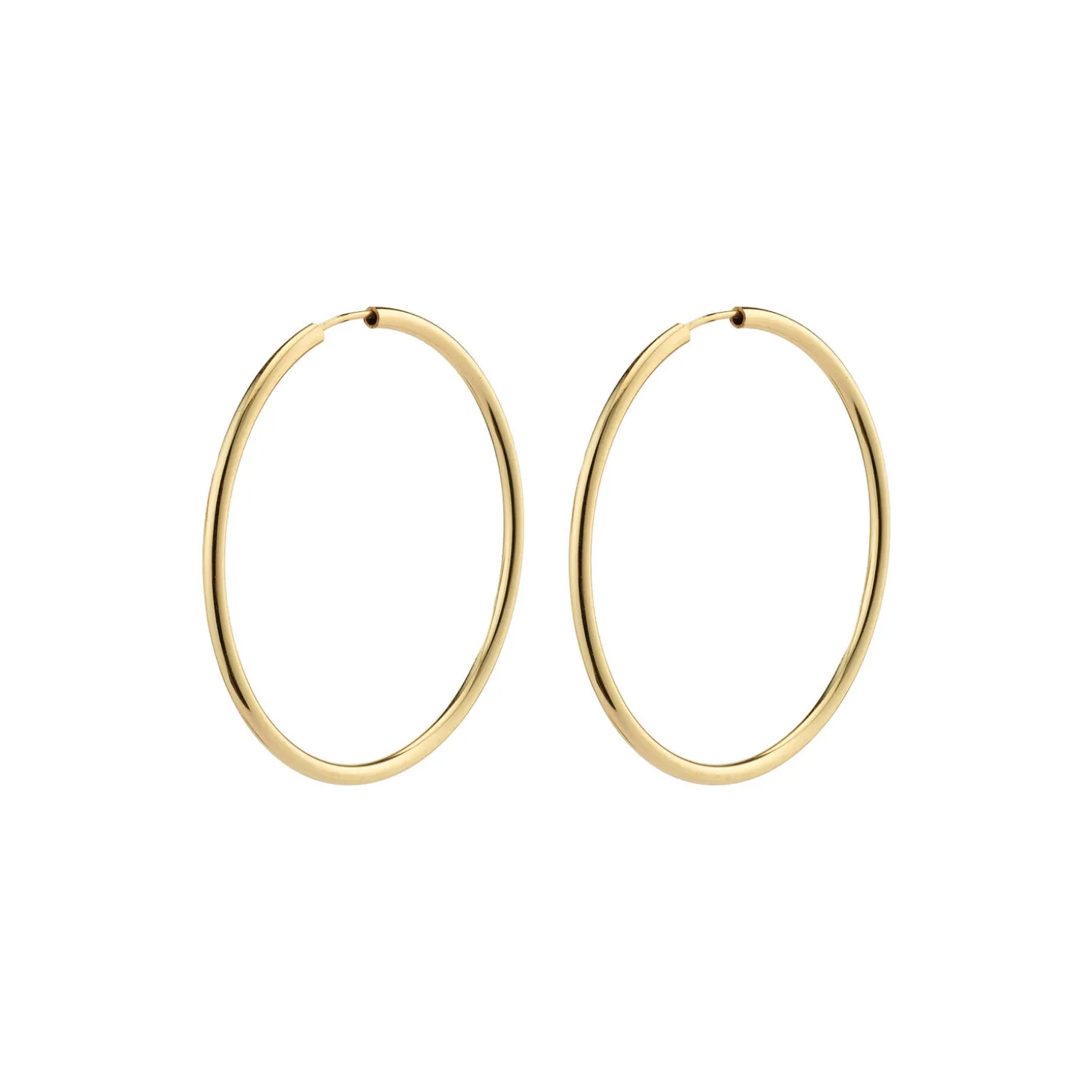 Golden goodies for your look! Guldbelagte hoops med en diameter på 40 mm. Et sæt medium sized klassikere, der passer perfekt til alt! Mix gerne de enkle hoops med andre øreringe i et trendy ear curation look, hvor du skaber din helt egen personlige stil. Øreringene er recycled og lavet af 99% genanvendt materiale.