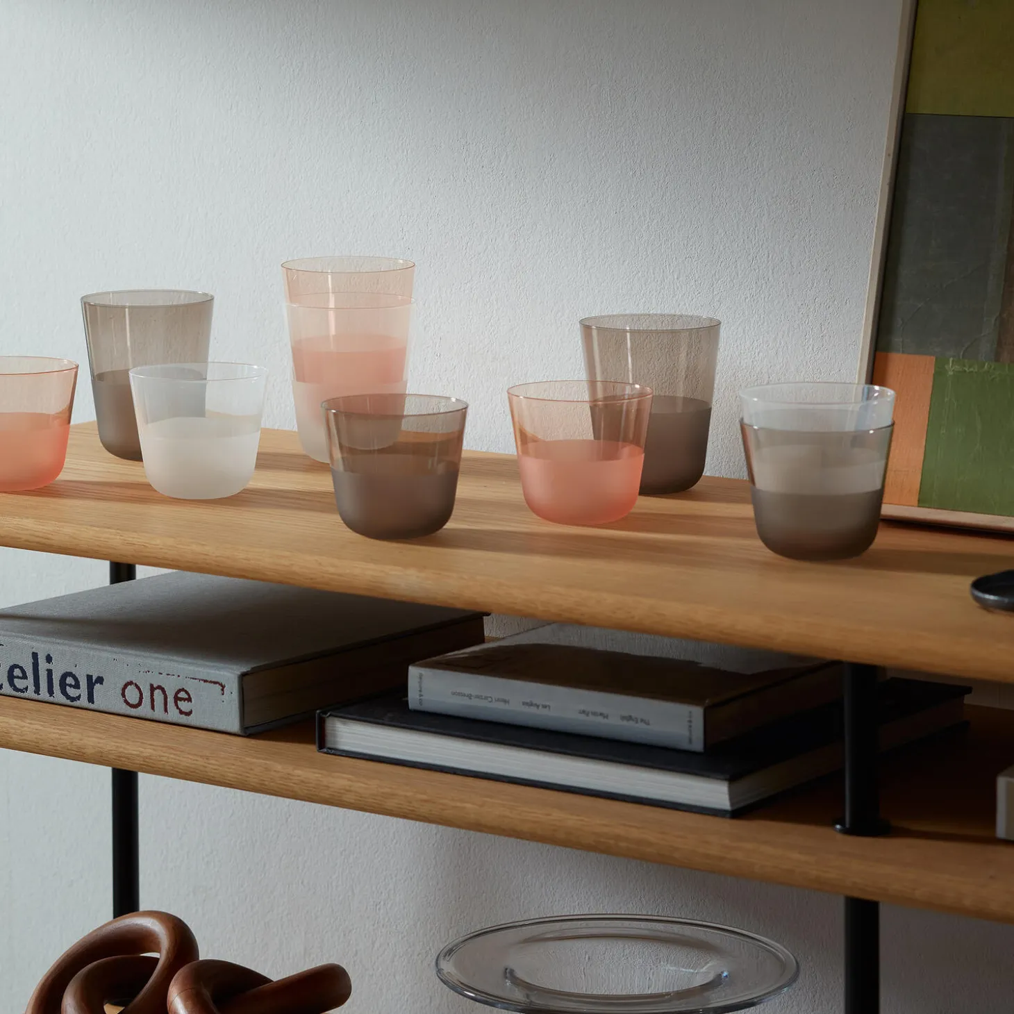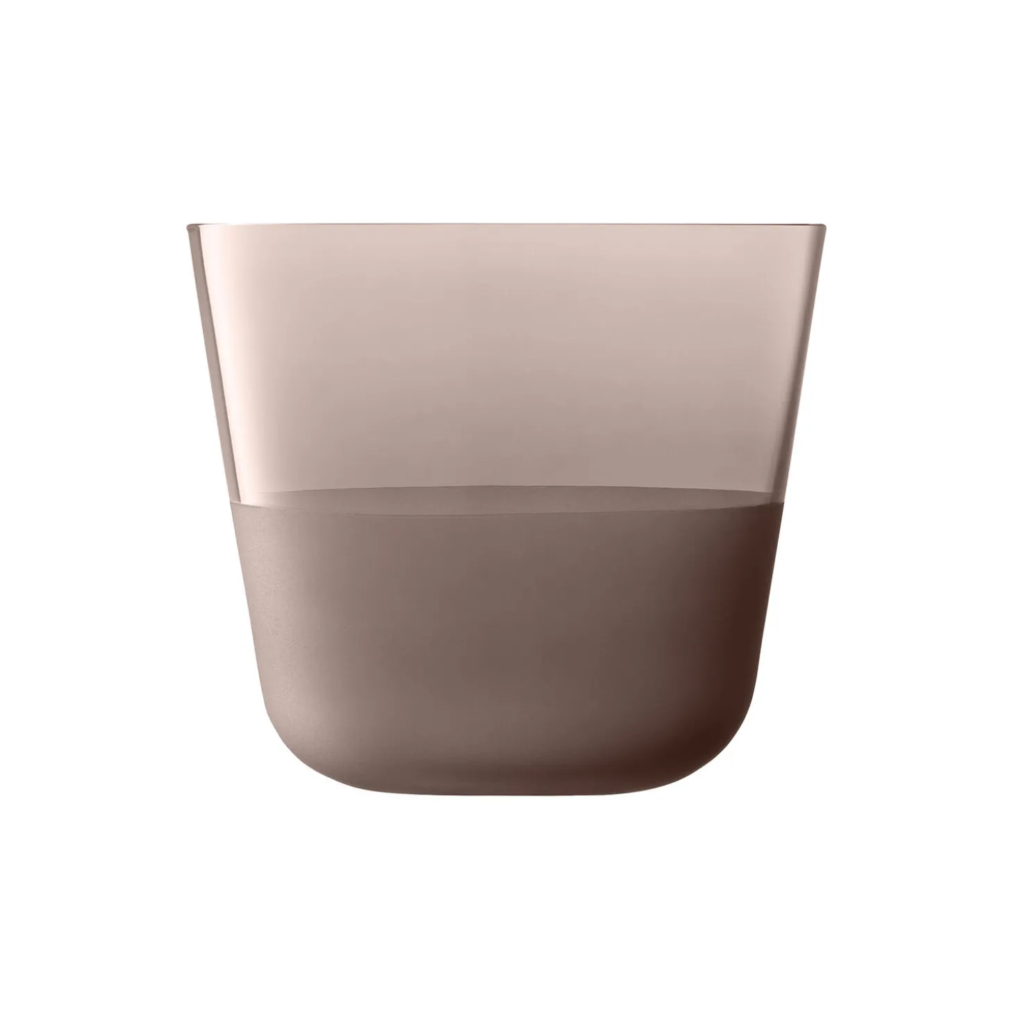 Et sæt af to glas med afrundede bunde, blødt tilspidsede profiler og en mat tekstureret finish på den nederste halvdel. En alsidig form til vin, vand og korte cocktails. Fremstillet af soda-lime glas for klarhed og styrke, og designet til hverdagen. Økologisk fareve, stabelbar og tåler opvaskemaskine.