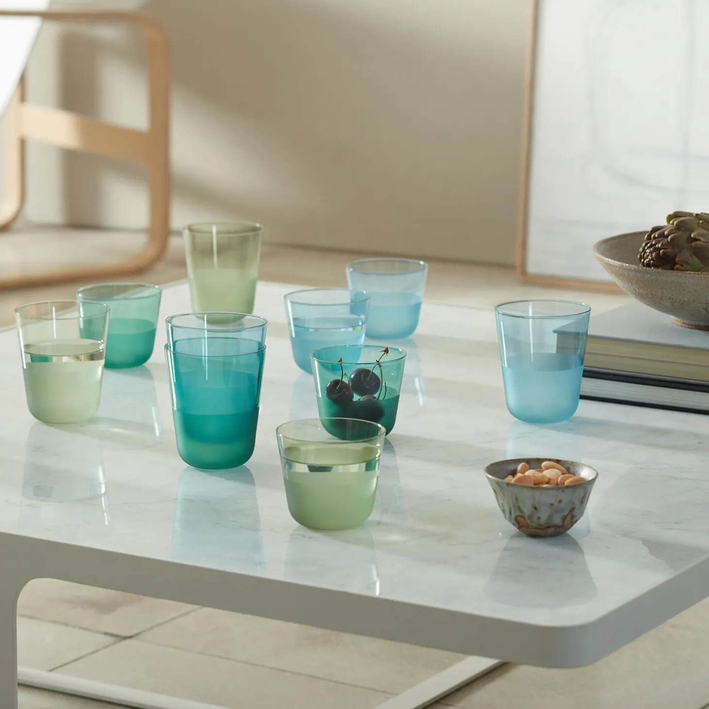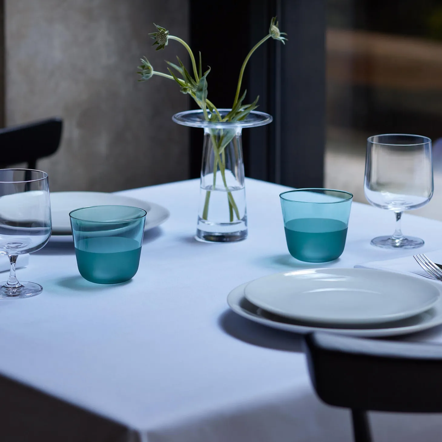 Et sæt af to glas med afrundede bunde, blødt tilspidsede profiler og en mat tekstureret finish på den nederste halvdel. En alsidig form til vin, vand og korte cocktails. Fremstillet af soda-lime glas for klarhed og styrke, og designet til hverdagen. Økologisk fareve, stabelbar og tåler opvaskemaskine.