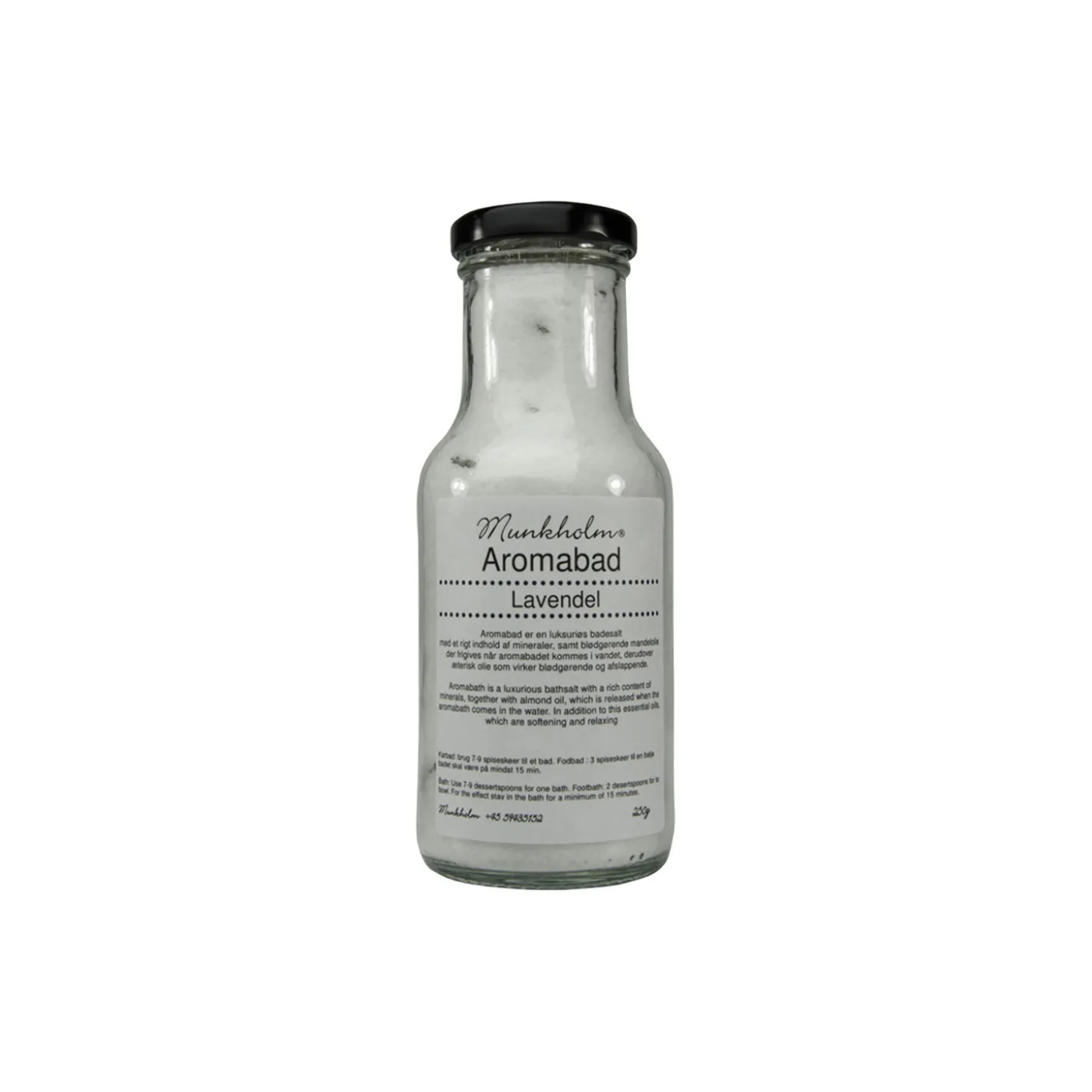 Aromabad badesalt med soltørret fransk middelhavssalt fra Munkholm. Lindrende ved muskelsmerter, blødgørende, beroligende og afslappende. Duft: lavendel. Indeholder: 250 g.