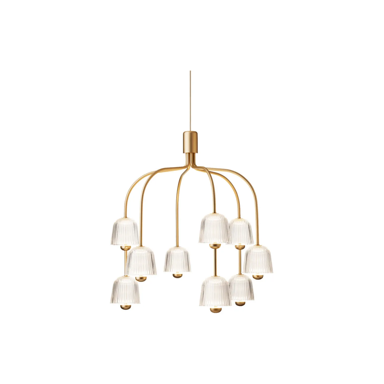 Lysekronen Asteea 9 har en unik konstruktion med to lyskilder på hver anden arm, hvilket skaber et let og fleksibelt design, som oplyser rummet blødt uden blænding. De rillede akrylskærme reflekterer lyset og skaber et subtilt, levende spil, der fremhæver lampens elegance.