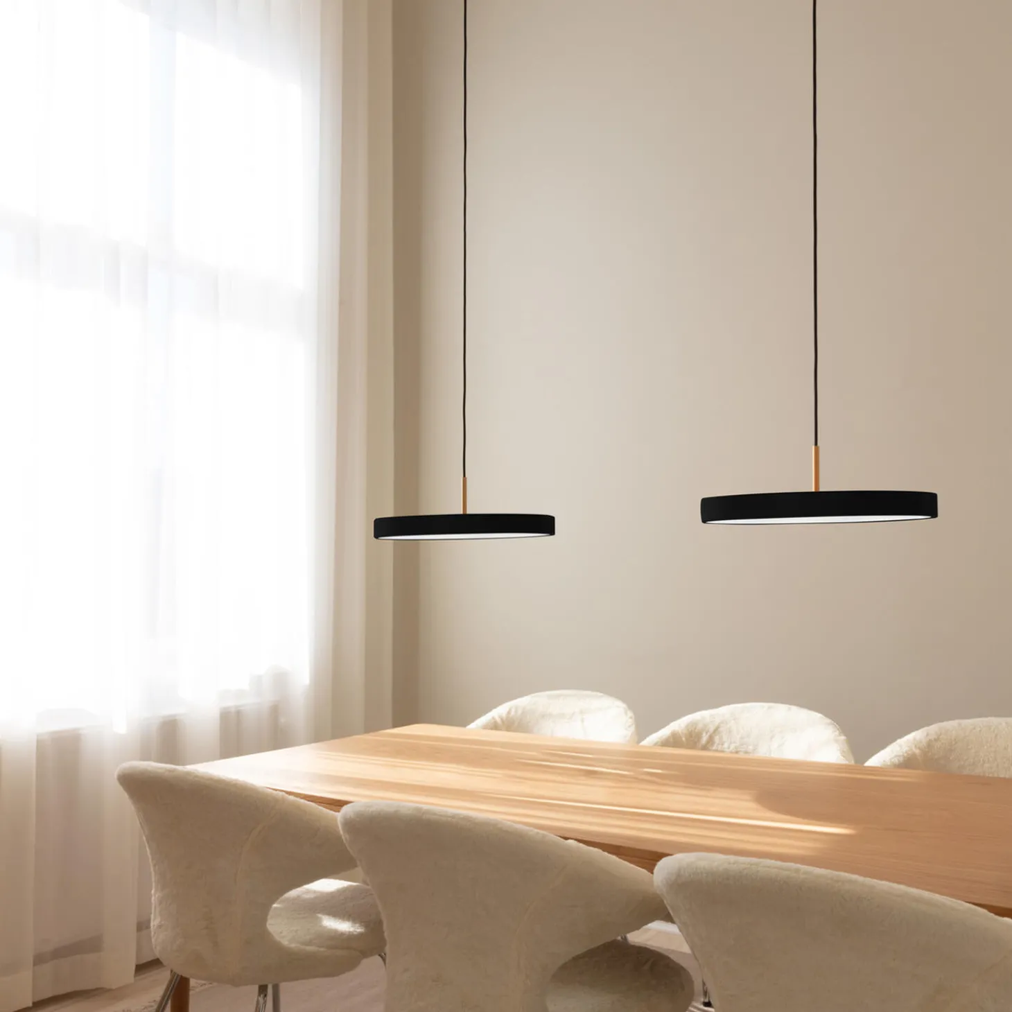 The Asteria Plus takes the classic Asteria pendant lamp to new heights by offering a built-in dimmer and compatibility with track lighting, making it perfect for the office, private dining settings or kitchen areas. It combines functionality and versatility, catering to the needs of spaces where adaptability and style are of utmost importance.The Asteria Plus pendant lamp’s sleek appearance and clean lines represent minimalistic beauty, while a built-in LED panel infuses the space with soft and timeless illumination. With a hidden button by the lamp’s top, you can effortlessly adjust the light temperature to create the perfect atmosphere, whether it be for focused work or a relaxed ambience. The lamp is dimmable with the use of an external dimmer. Asteria Plus is in a variety of different colours in medium and mini and features a brass top that can easily be interchanged with steel or black, providing endless design possibilities that align with your personal style.