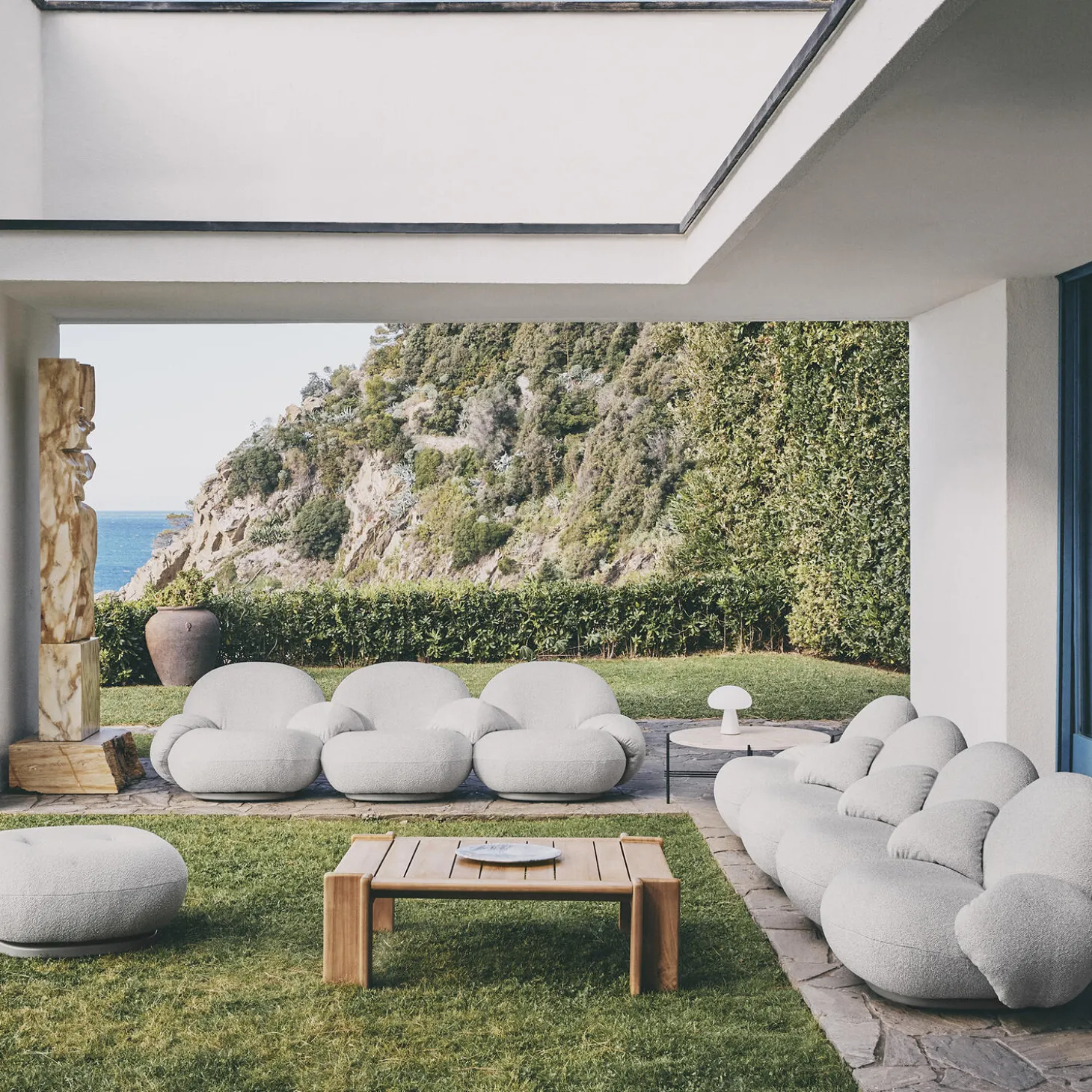 Atmosfera Coffee Table i teak fra GUBI. Farve: teak. Mål: H: 35,5 x L: 113 x B: 100 cm. Design: The Gubi Design Team.
