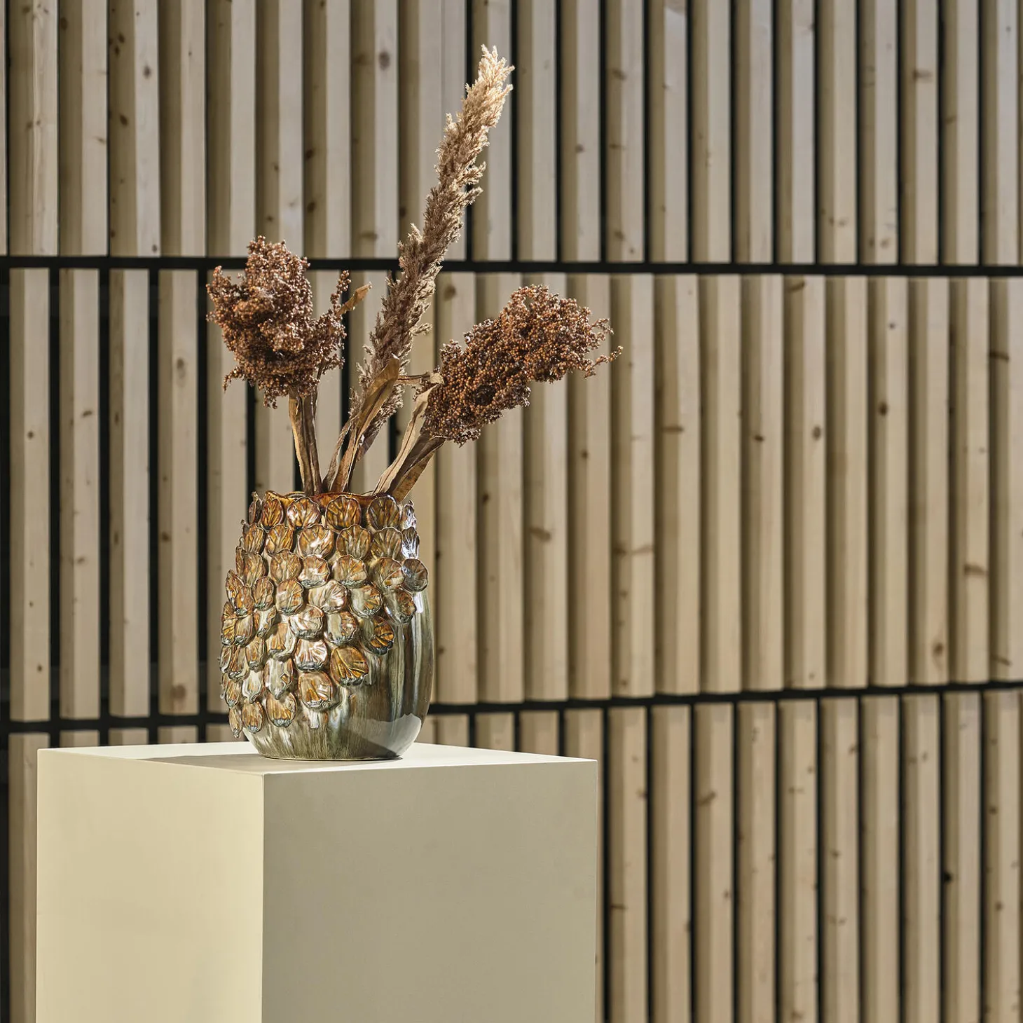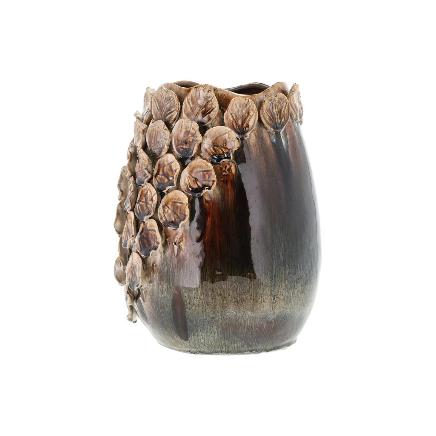 Virkelig flot og skulpturel stentøjsvase, der både er imponerende med en stor buket blomster og som en dekoration i sig selv. Vasen er dekoreret med smukke blade inspireret af naturen, disse er alle formet og sat på i hånden.