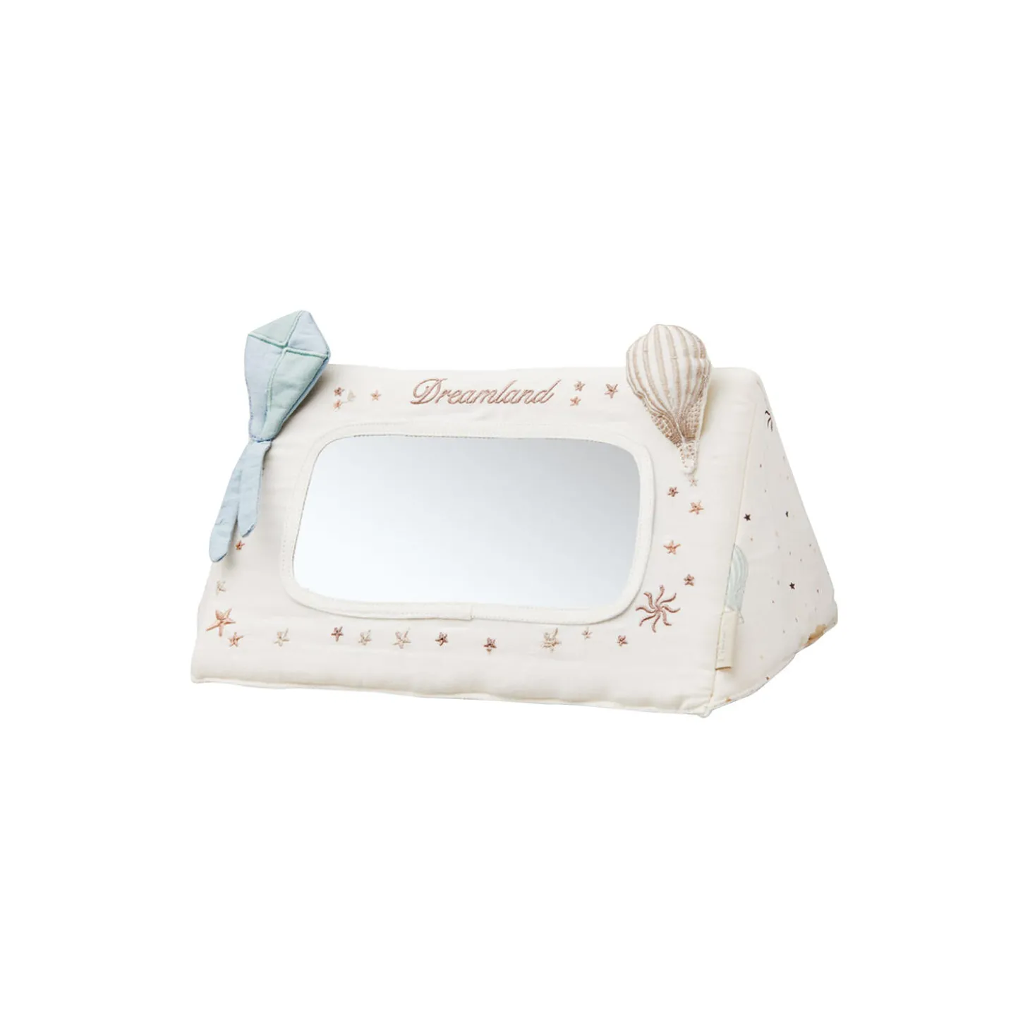 Sæt gang I nysgerrigheden og fantasien med vores søde Dreamland gulvspejl til baby. Spejlet er perfekt til at motivere baby til at ligge på maven og løfte hovedet og dermed træne rygmuskulaturen. Spejlet har sjove knitrelyde og en pivelyd i bladet i øverste hjørne, som kan stimulere finmotorikken, når babyen rækker ud efter den.Den perfekte gave til nyfødte og til baby shower. Baby Spejl i hvide og brune nuancer.