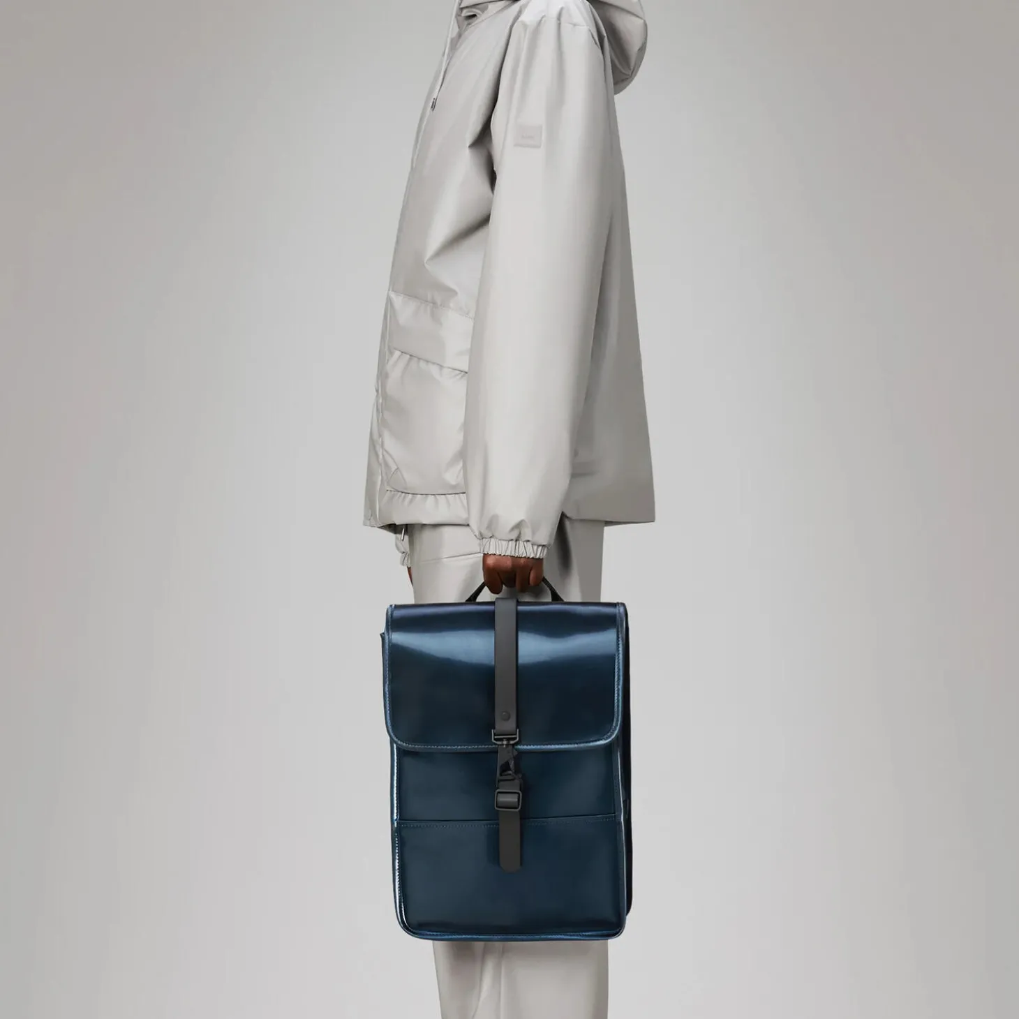 Backpack Mini is a downscaled version of Backpack. Silhouette is characterized by its squared shape and flap with magnet snap fastenings.This clean and ever contemporary rucksack features an internal laptop pocket, a spacious main compartment and a concealed external phone pocket on the back panel. The laptop pocket fits a 13 laptop with sleeve, making the squared backpack a perfect computer-ready staple for commuting on bike or by foot. Backpack Mini is cut from Rains’ signature PU fabric, engineered for carrying strength, durability and a smooth feel.